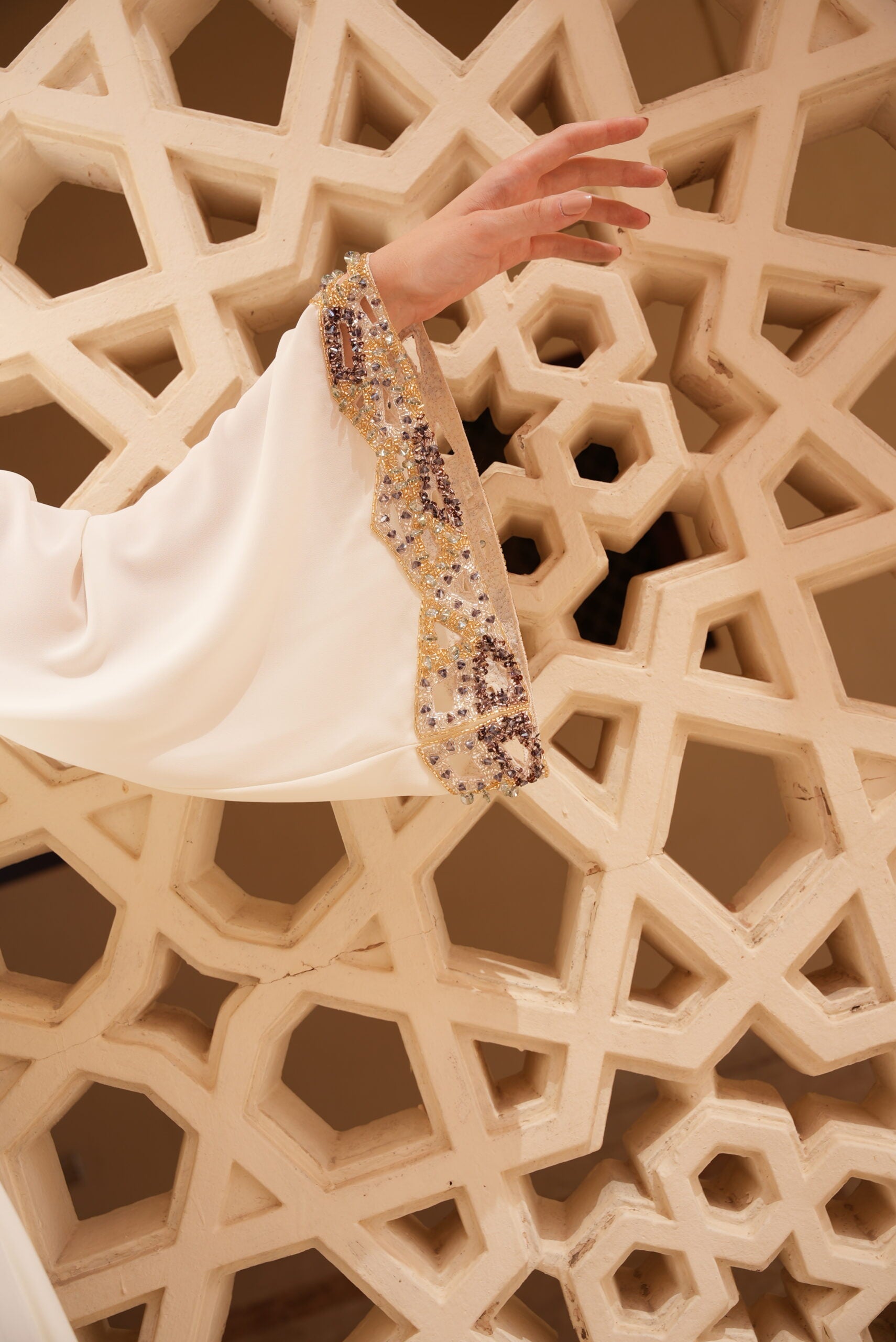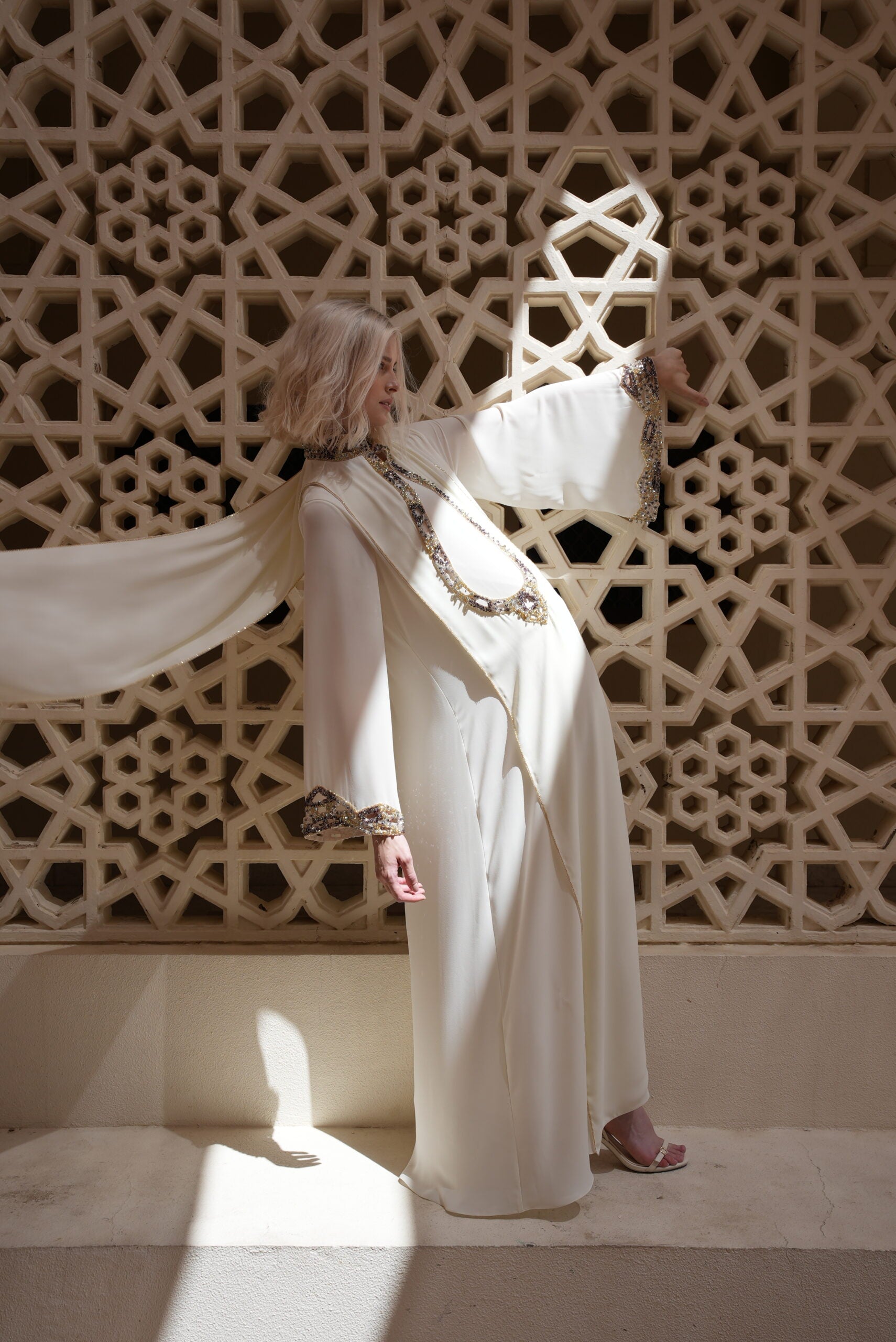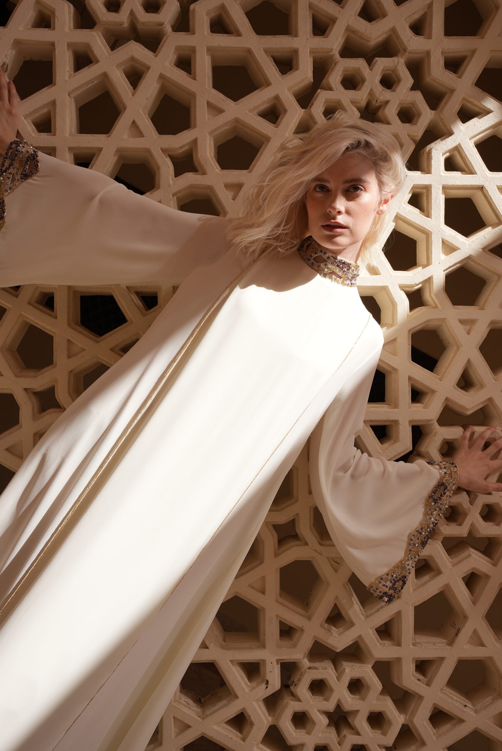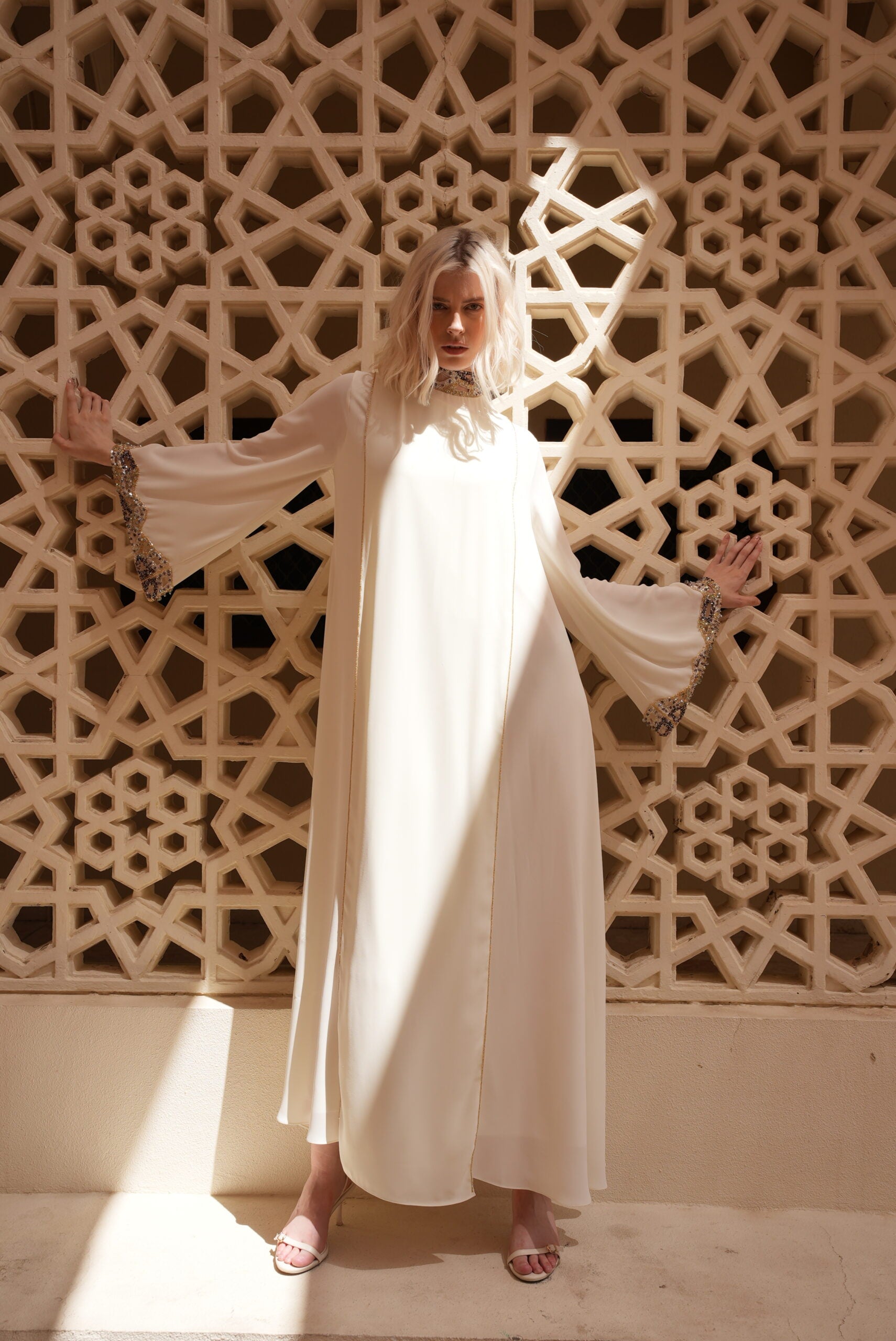 HIGH NECK INTERCHANGEABLE KAFTAN WITH CUTOUT EMBROIDERY ON FRONT & BACK NECK AND SLEEVES.