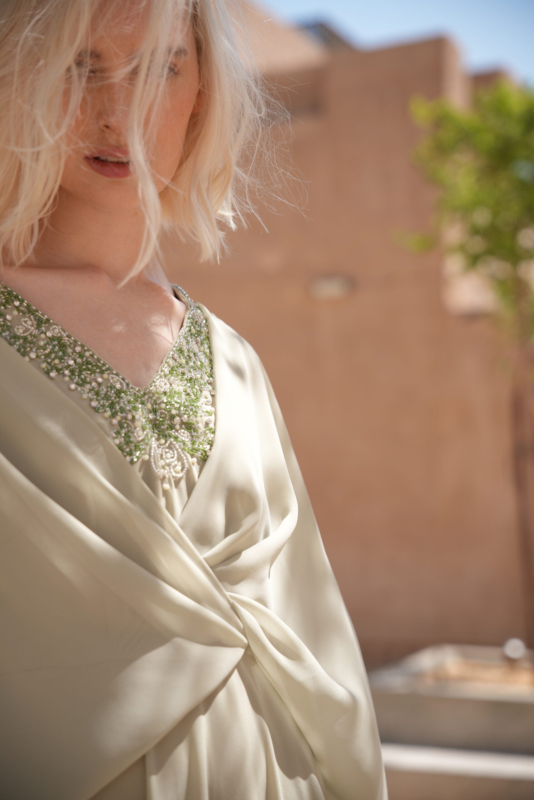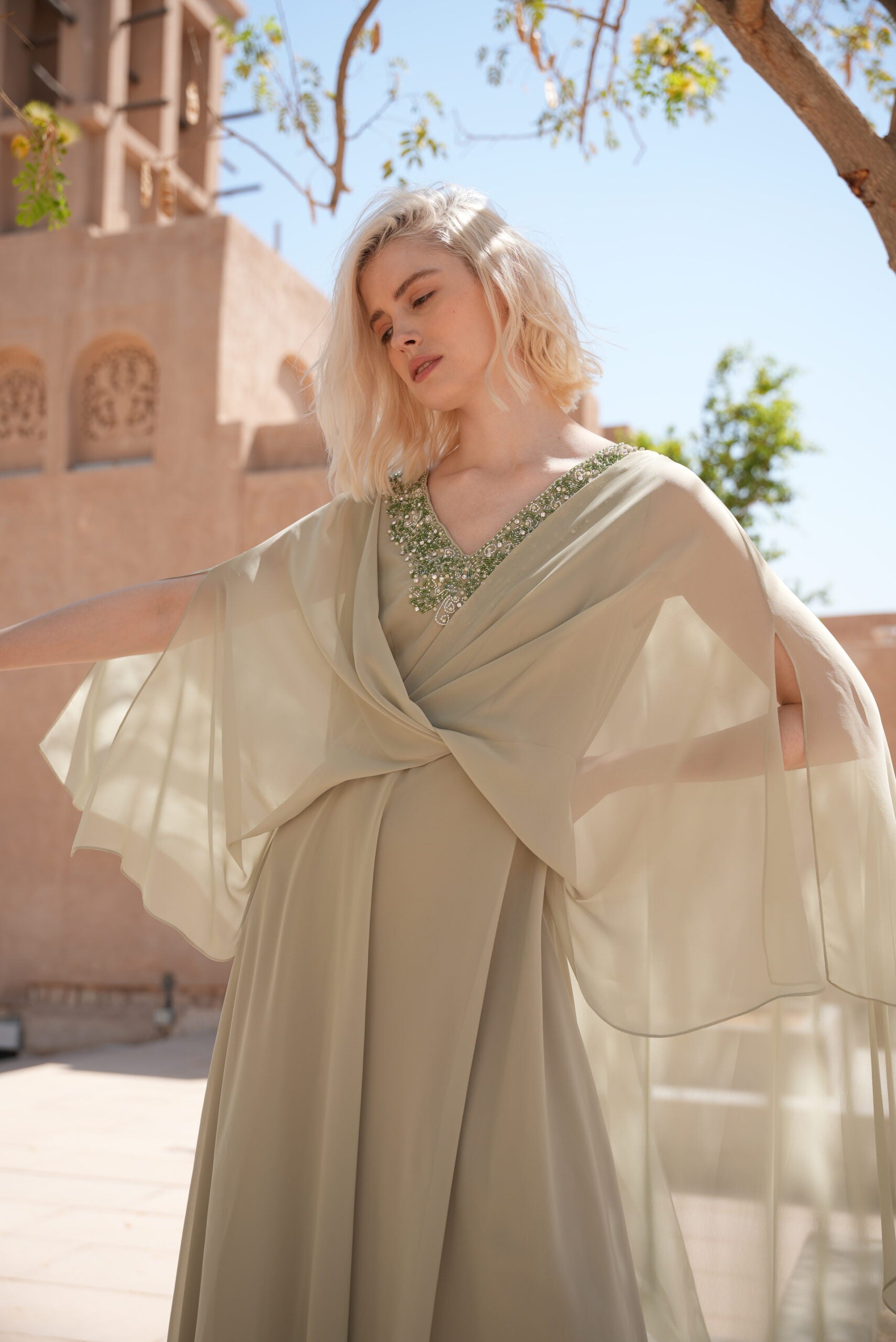 V NECK EMBROIDERED KAFTAN WITH TWISTED WAIST AND SLEEVE SLIT.