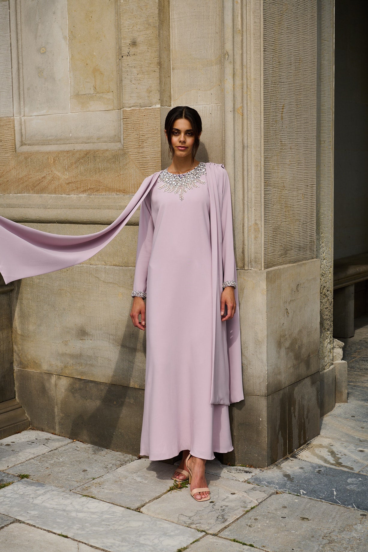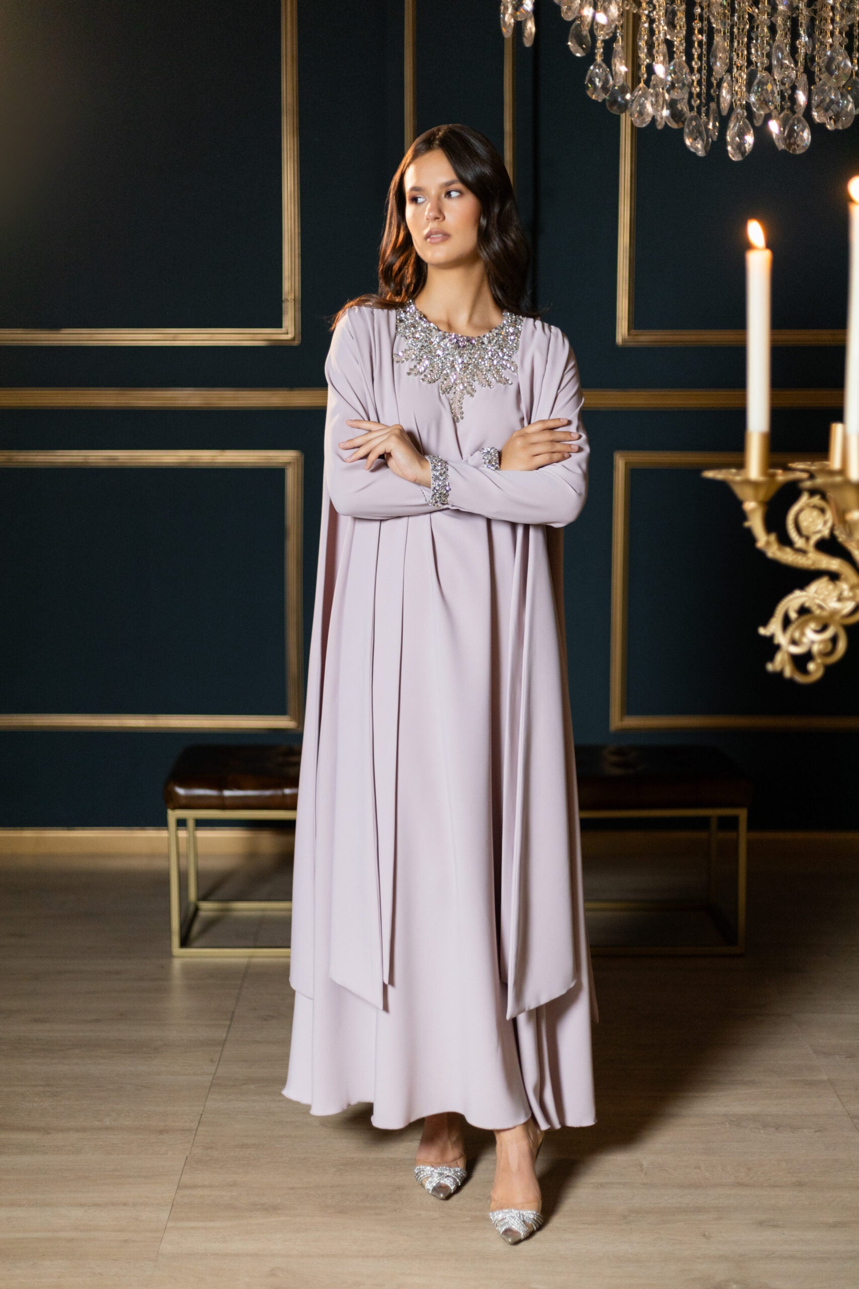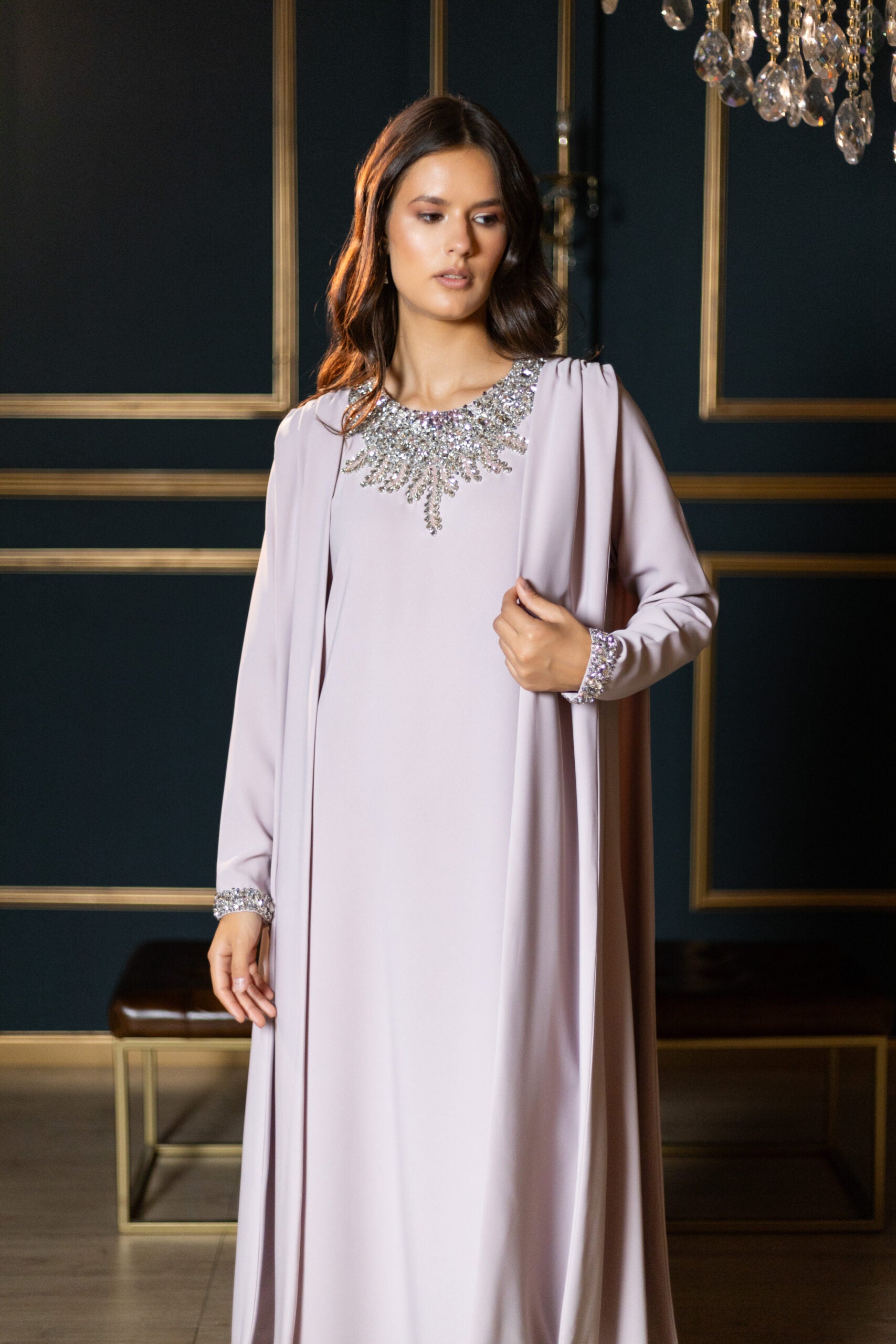 Chic Kaftan with Stone-Embellished Neckline and Tight Sleeves in Crepe Fabric.
