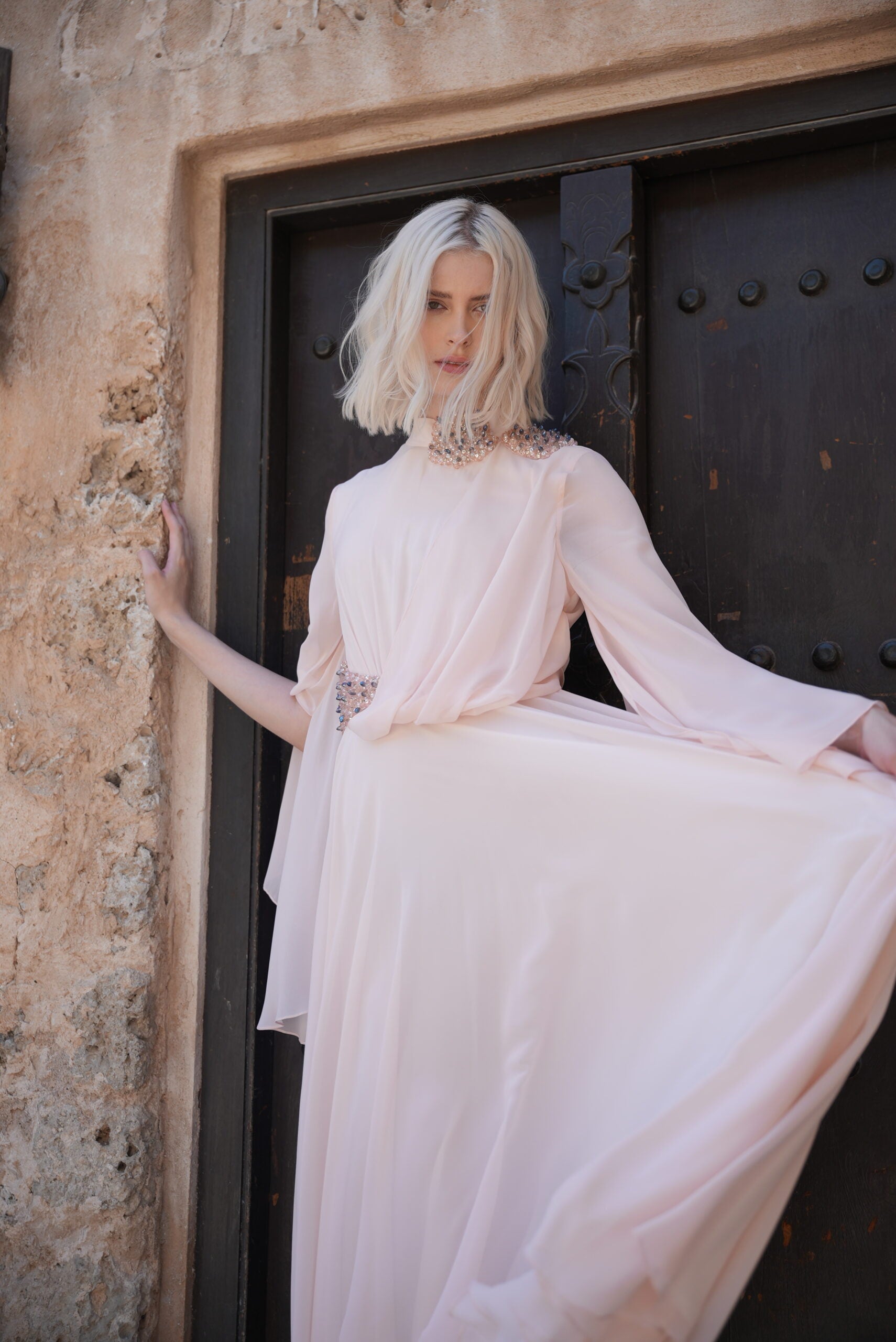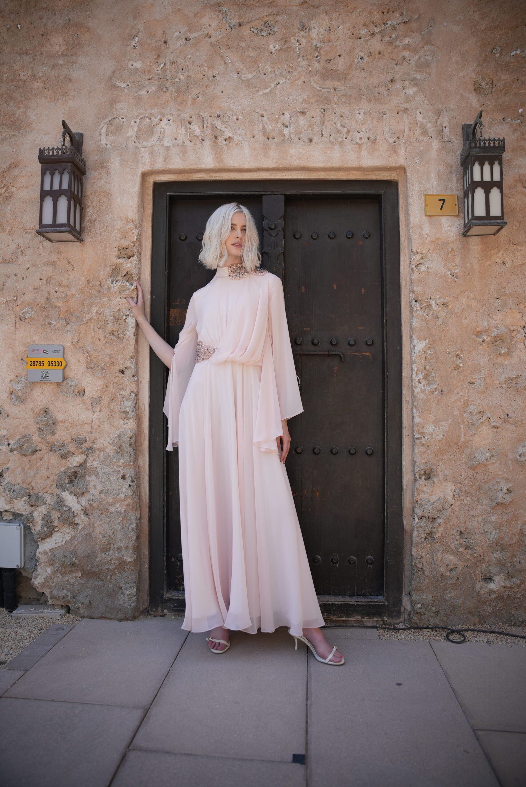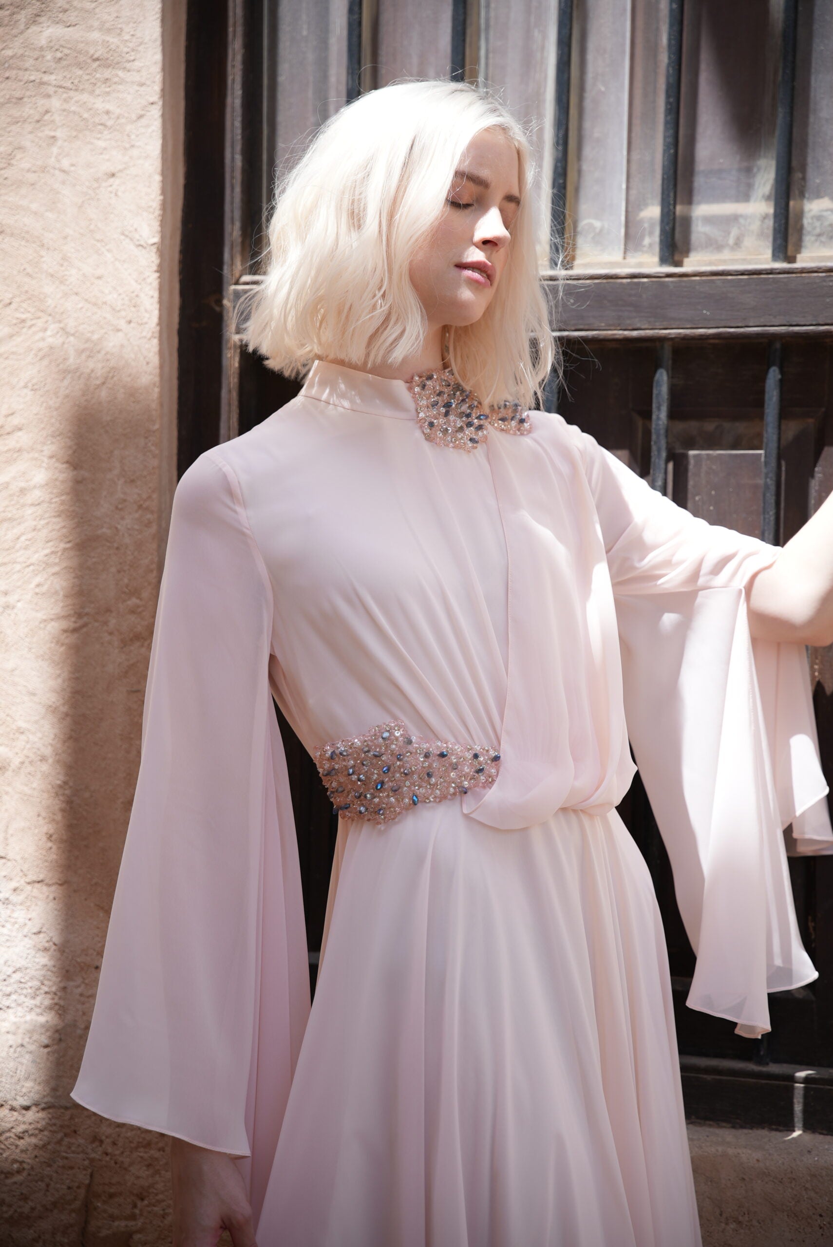قفطان برقبة عالية مع خصر ورقبة مطرزين، وأكمام واسعة وغطاء أمامي