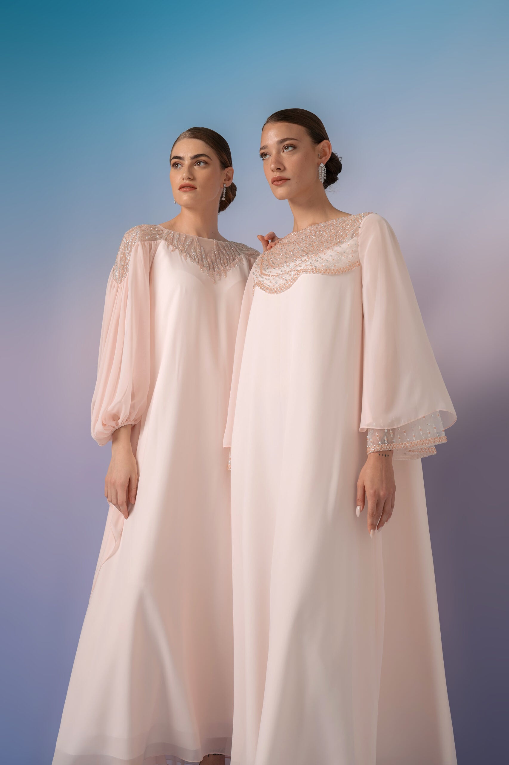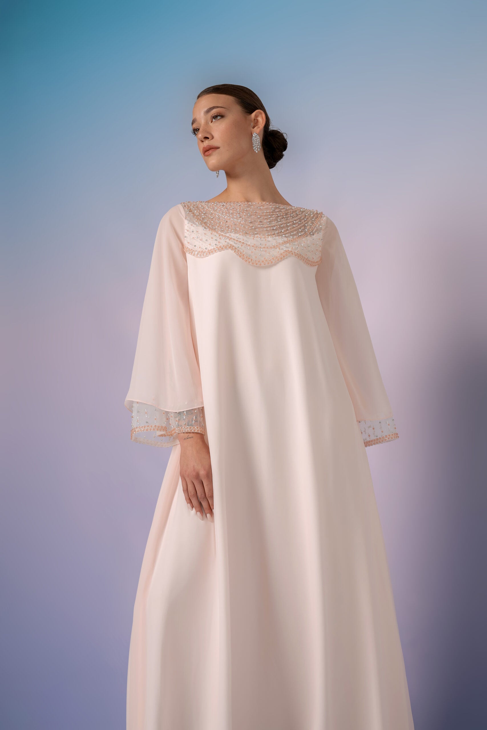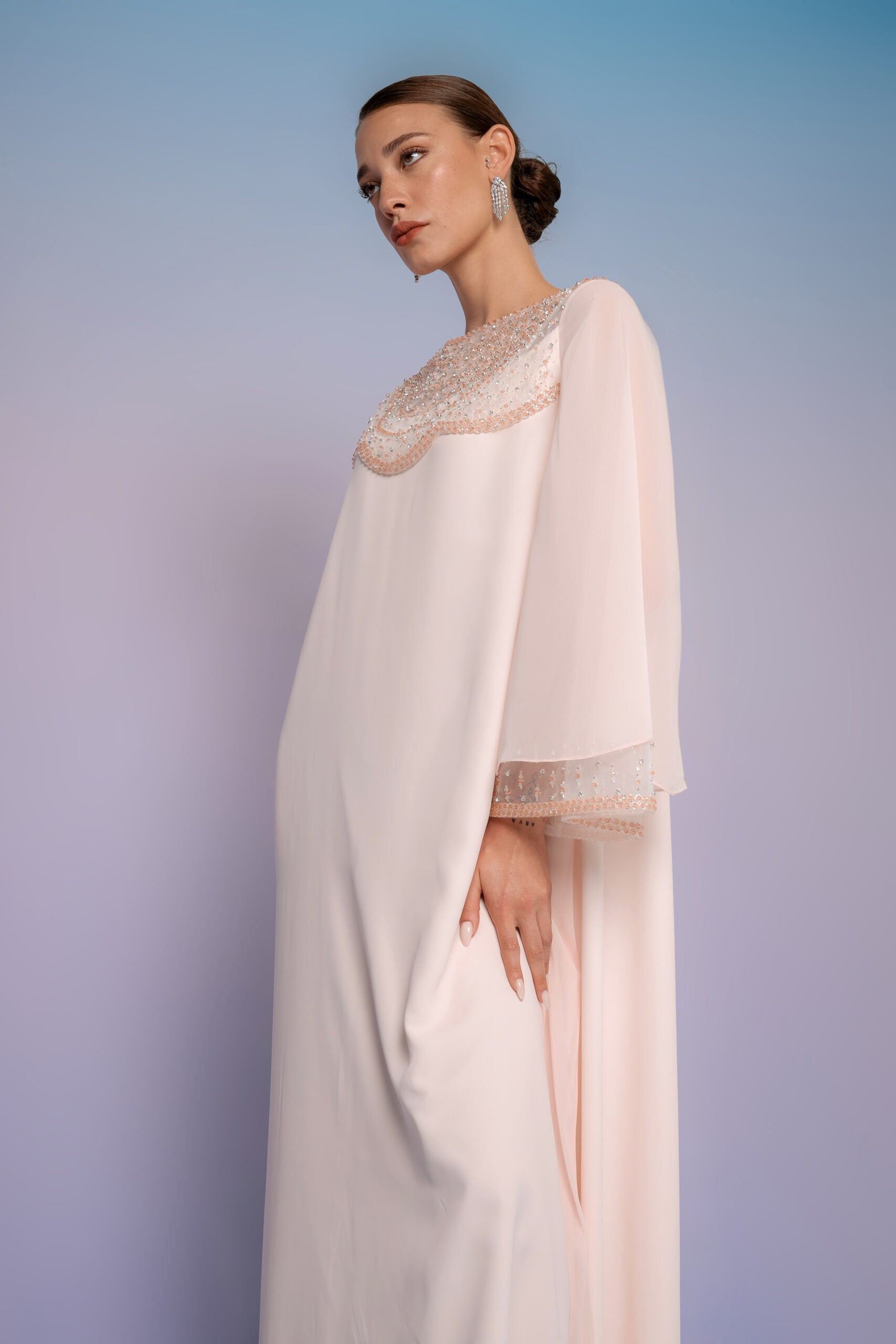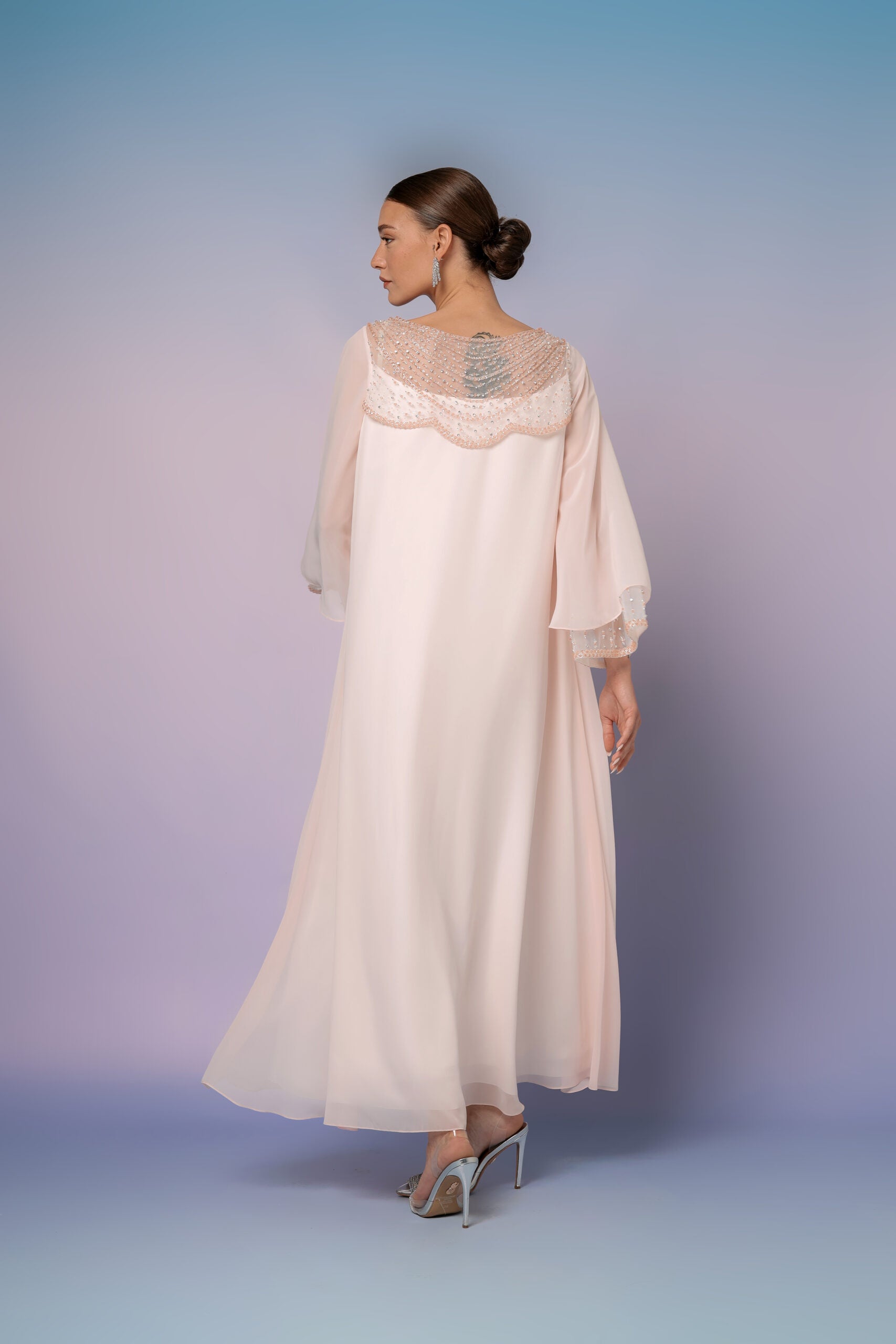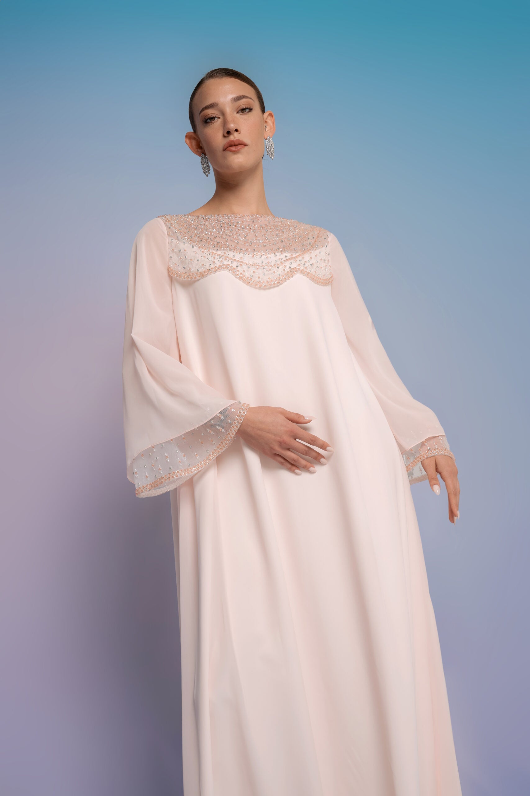 The kaftan exudes sophistication, crafted from a luxurious, soft fabric. Its embellishments draw inspiration from nature, adorning the neck and front body for a delicate and elegant touch to your outfit.