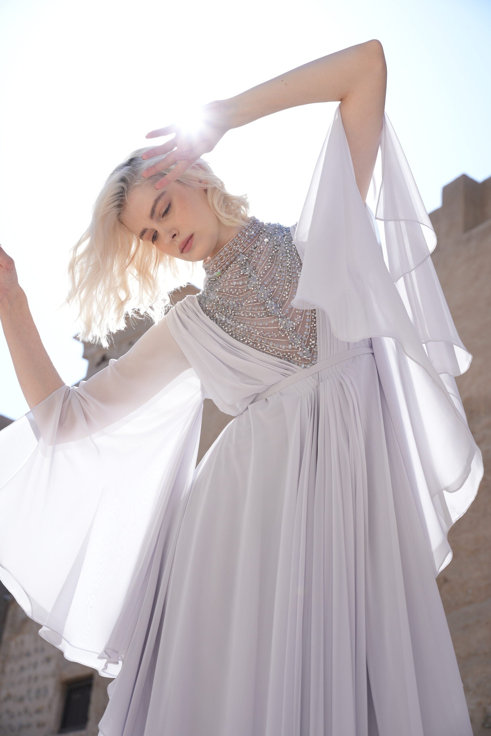PLEATED DRESS WITH A STATEMENT CRYSTAL MESH-BEADED NECKLINE PAIRED WITH A BELT.