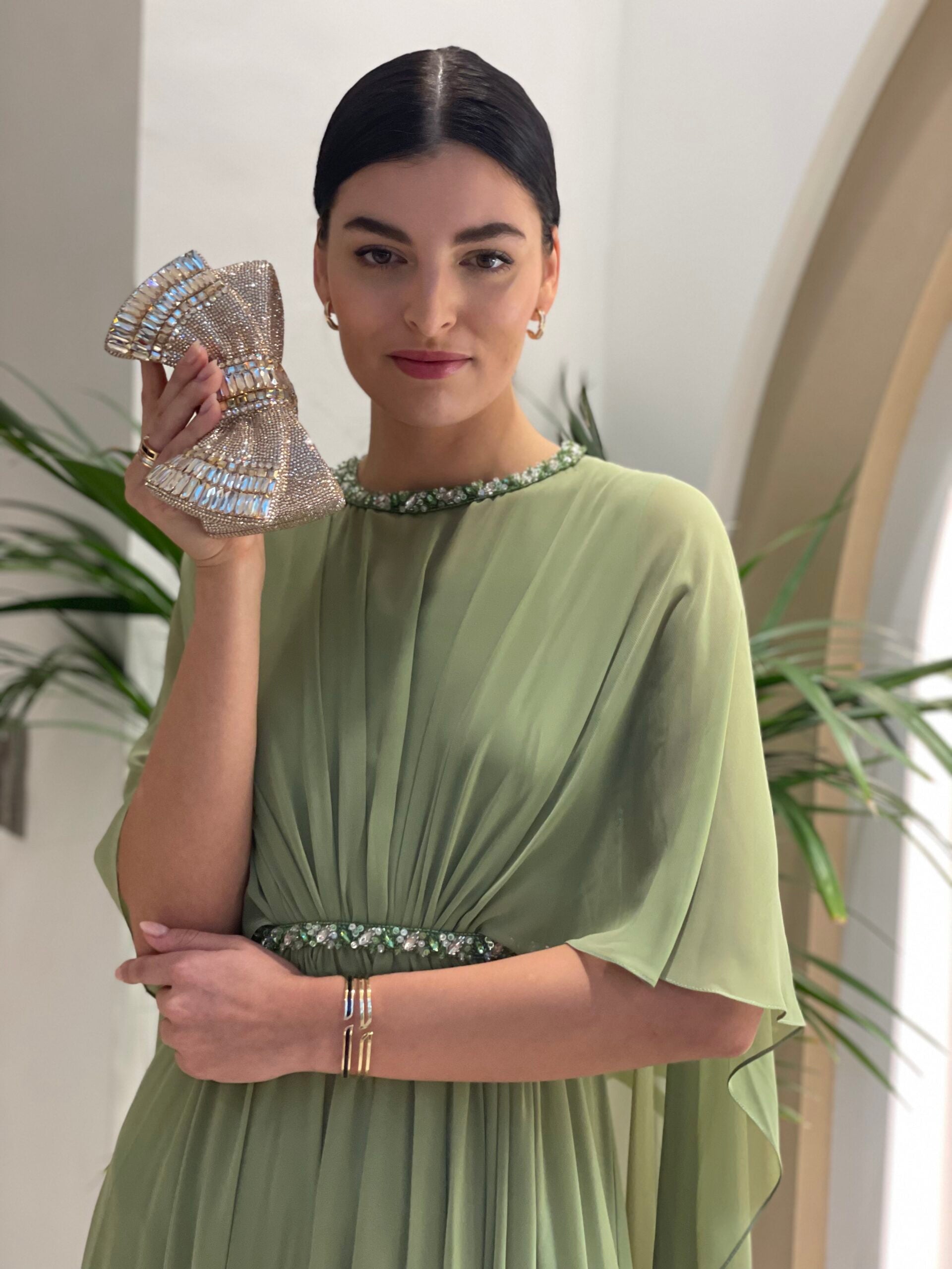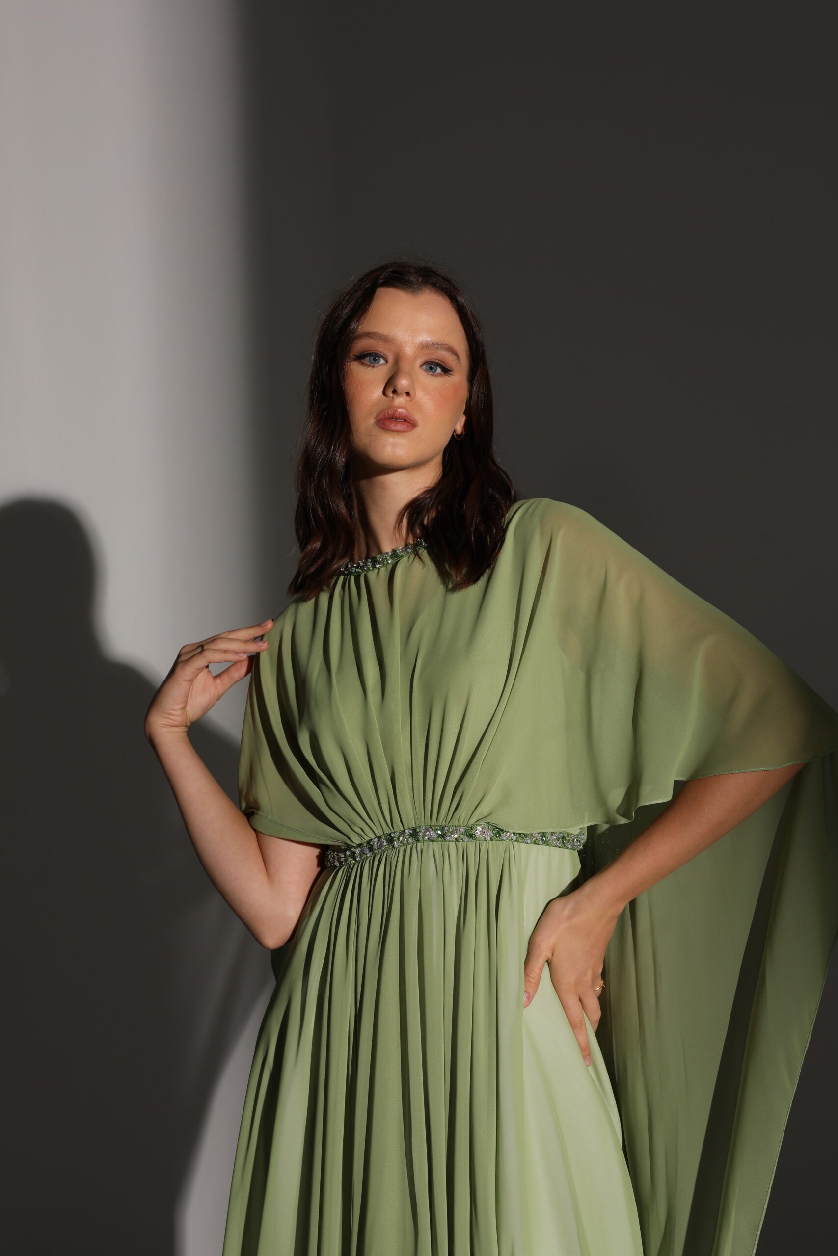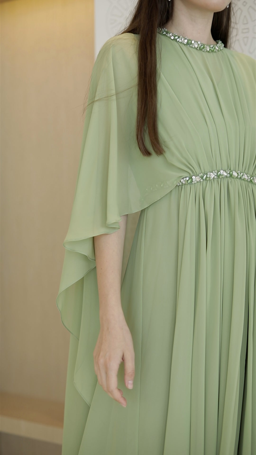 This pistachio-toned chiffon will effortlessly illuminate all skin tones while the hand embroidered waist flatters the feminine form elegantly. This piece will have you feeling like a movie star with shining detail on the waist and necklines but feeling comfortable and unrestricted as you attend any event day-to-night.