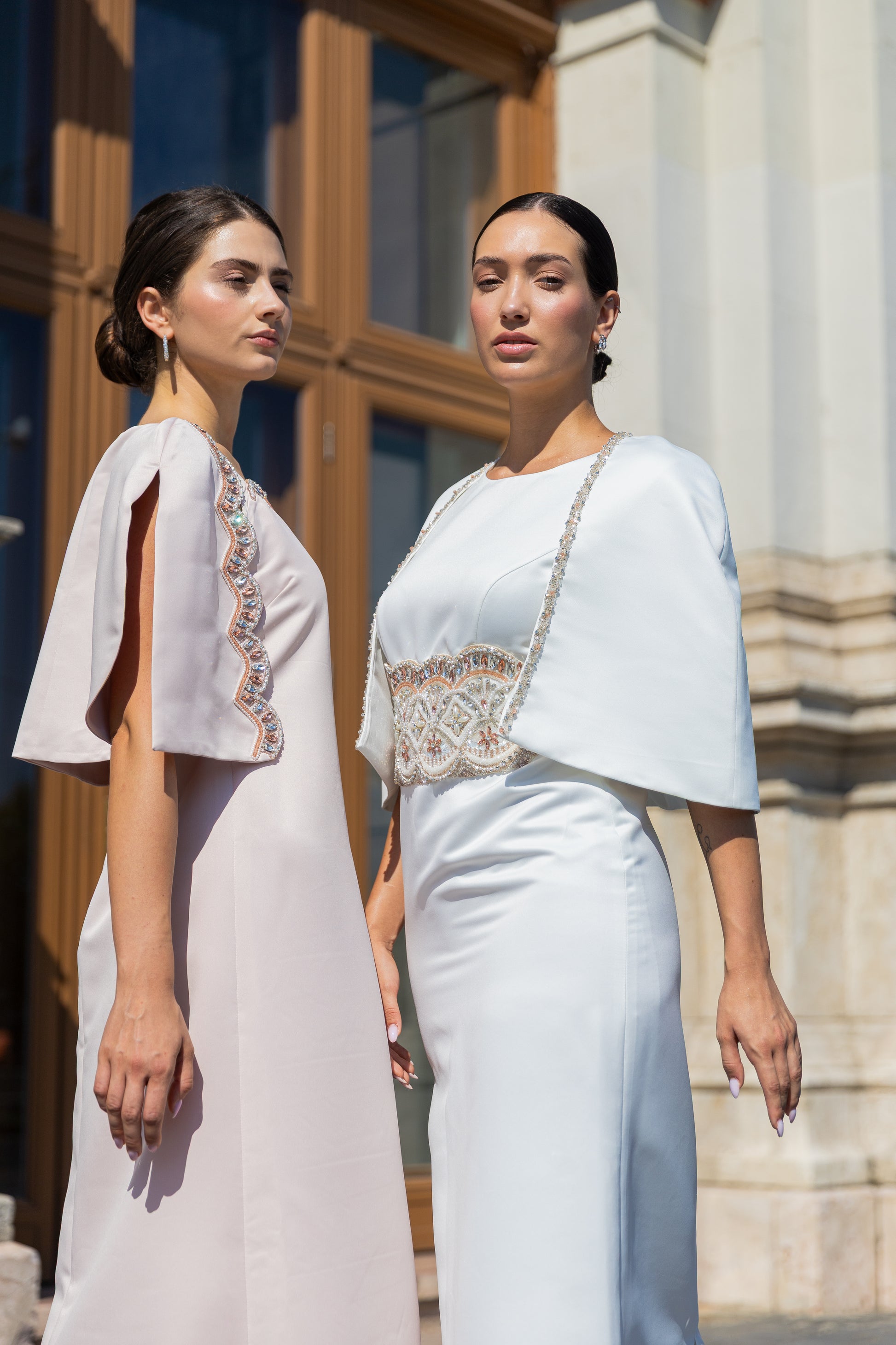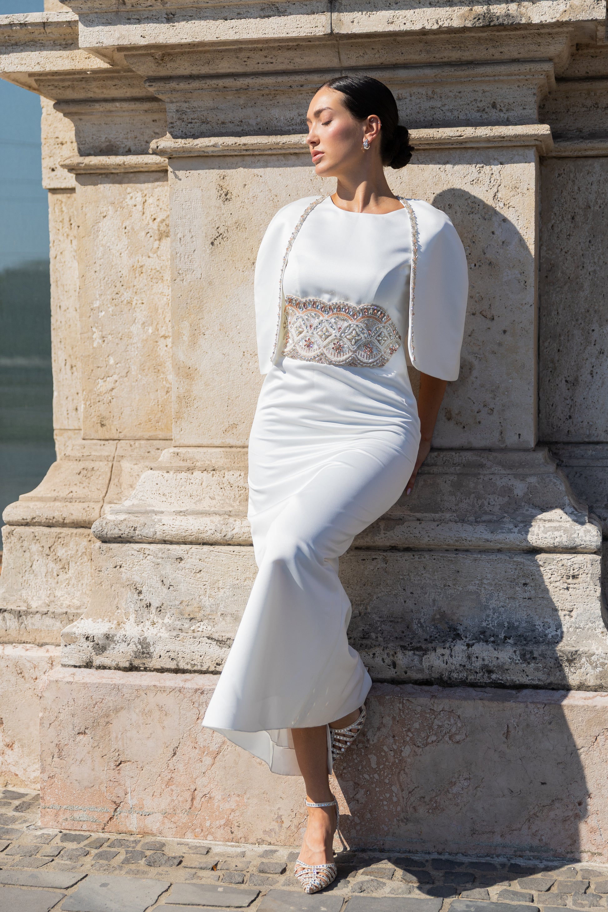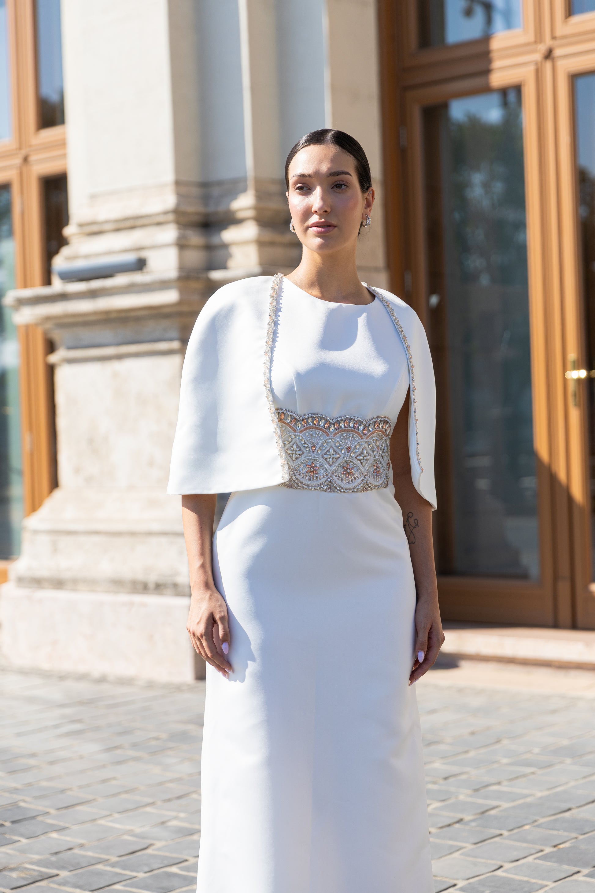 ROUND NECK FITTED DRESS WITH HEAVY EMBELLISHMENTS ON THE WAIST PAIRED WITH A SHORT DETACHABLE CAPE