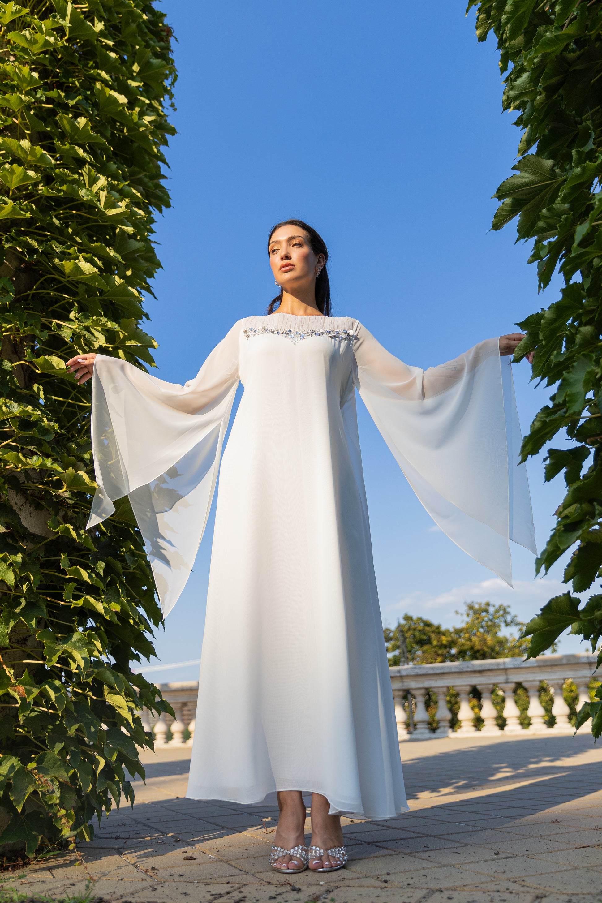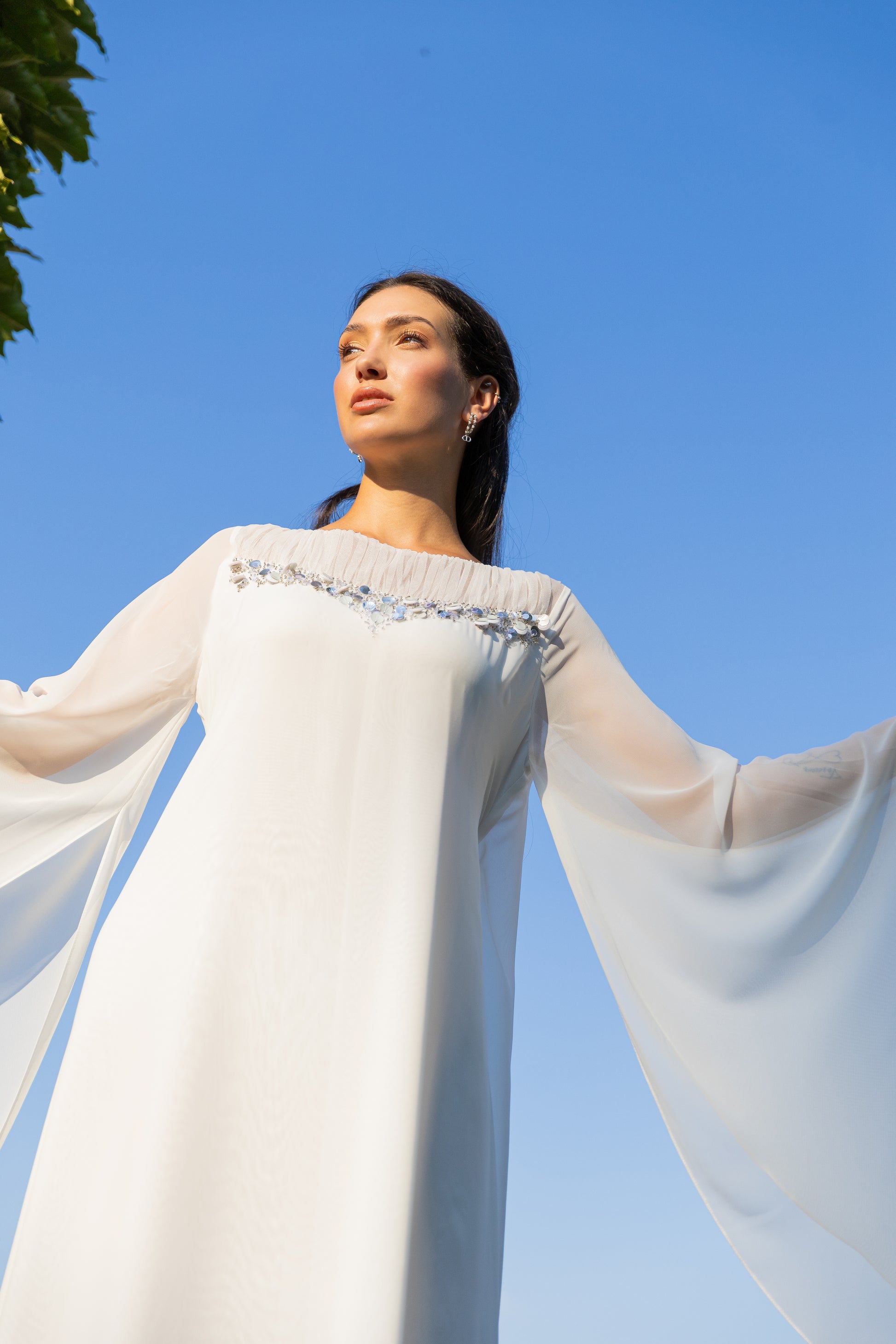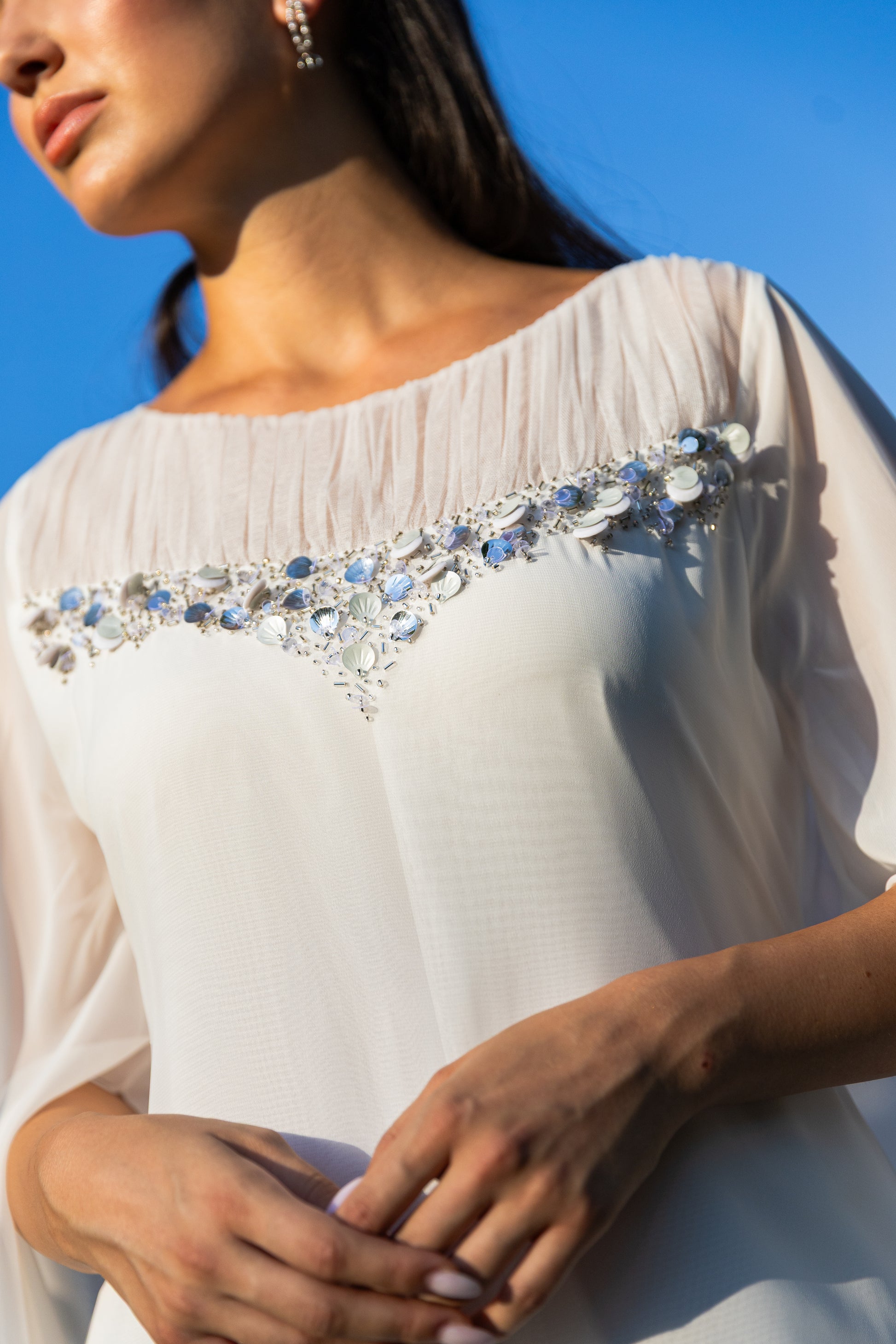 ROUND NECK A-LINE DRESS WITH FLOWY SLEEVES FEATURING GATHERS AND SEQUINED EMBROIDERY ON FRONT