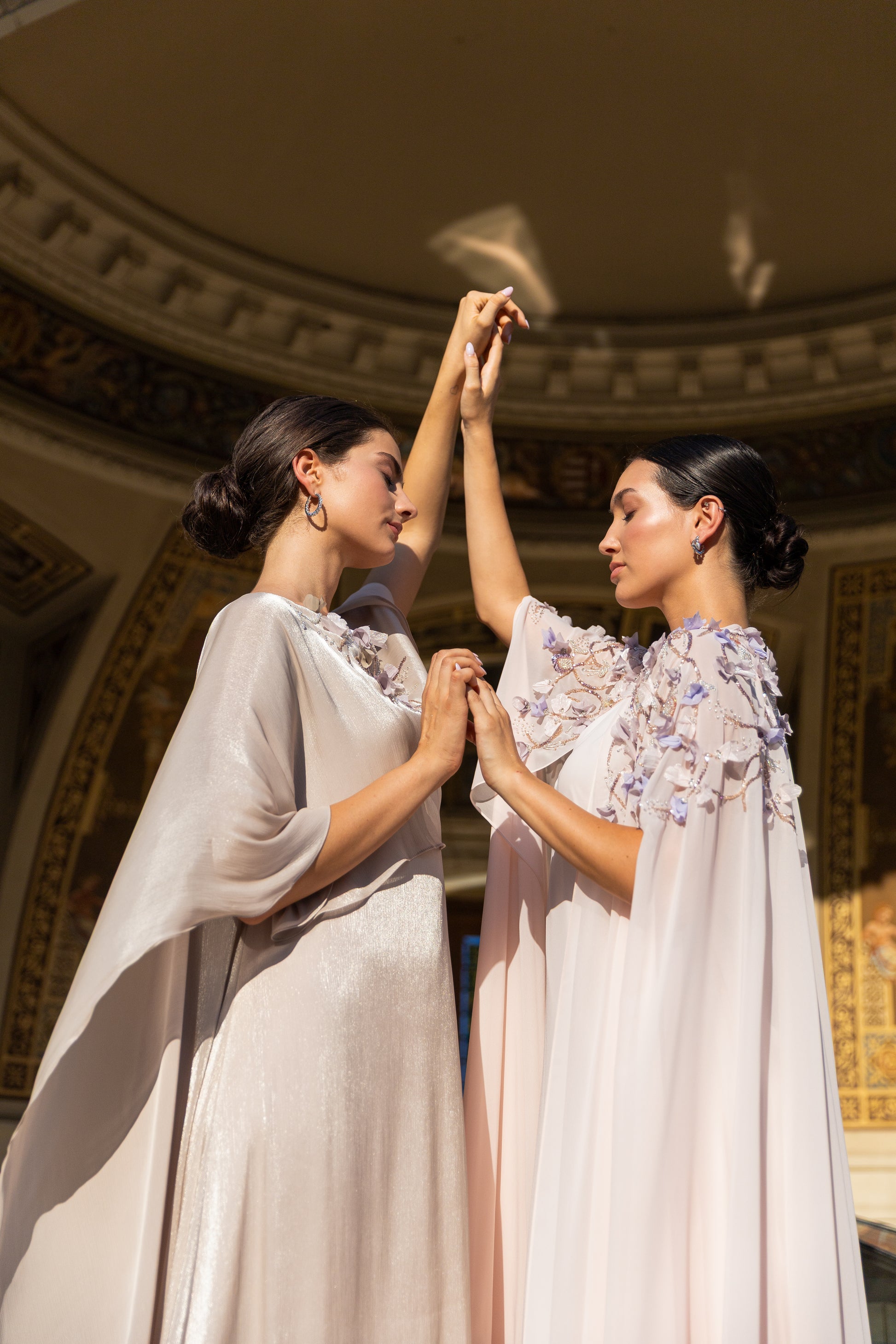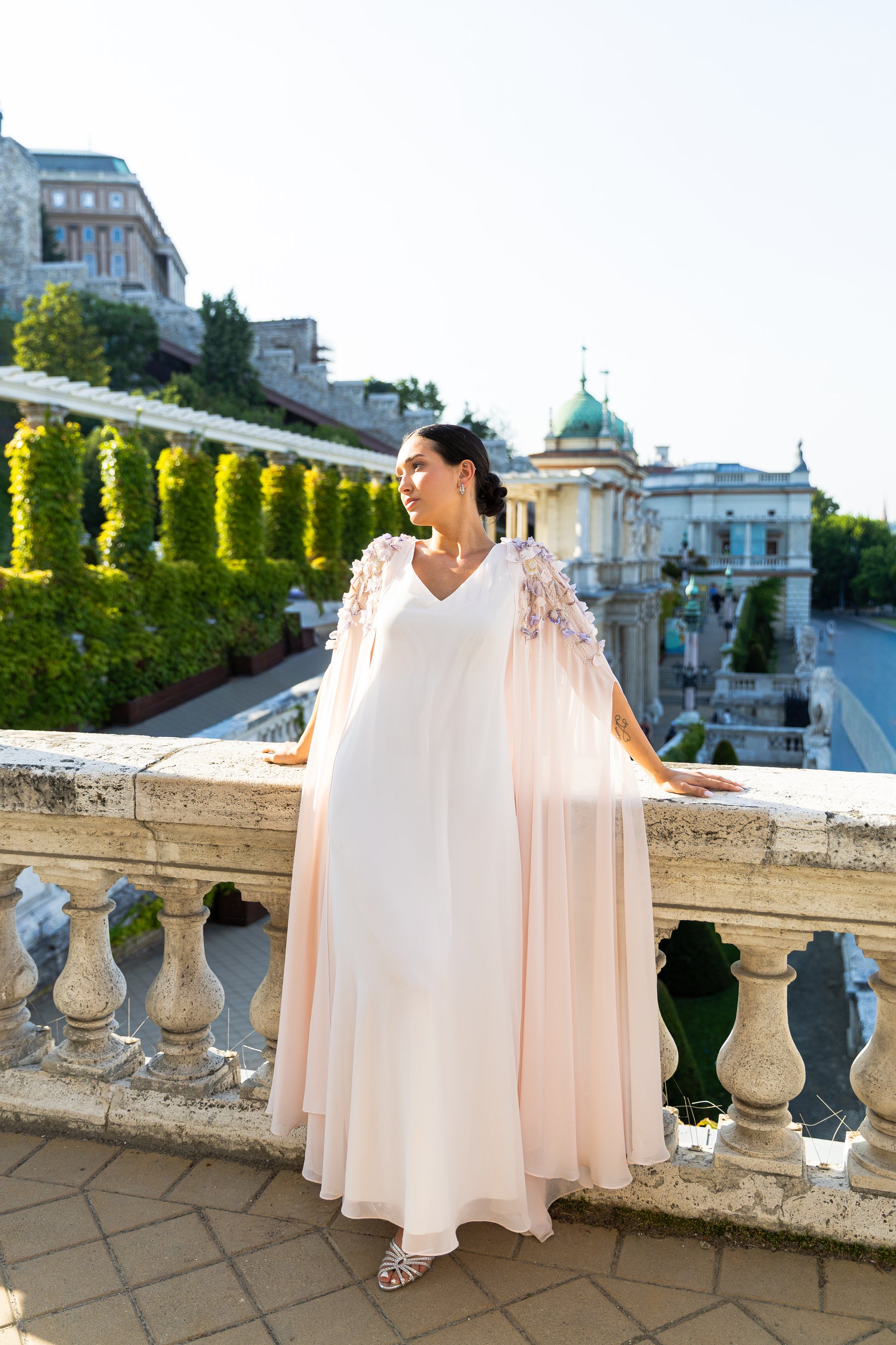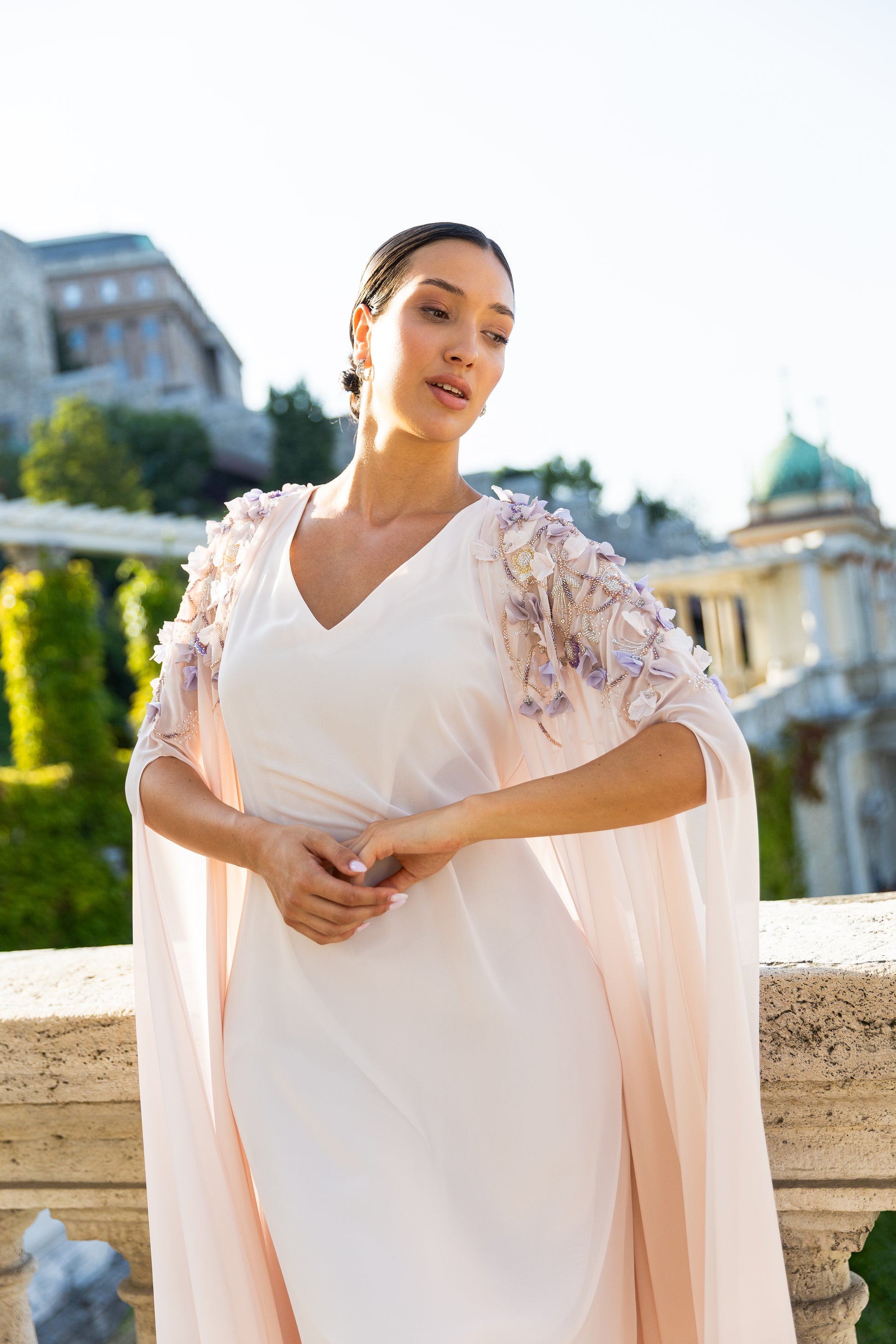 PETAL APPLIQUE EMBROIDERED FLOWY CAPE WITH V-NECK INNER DRESS