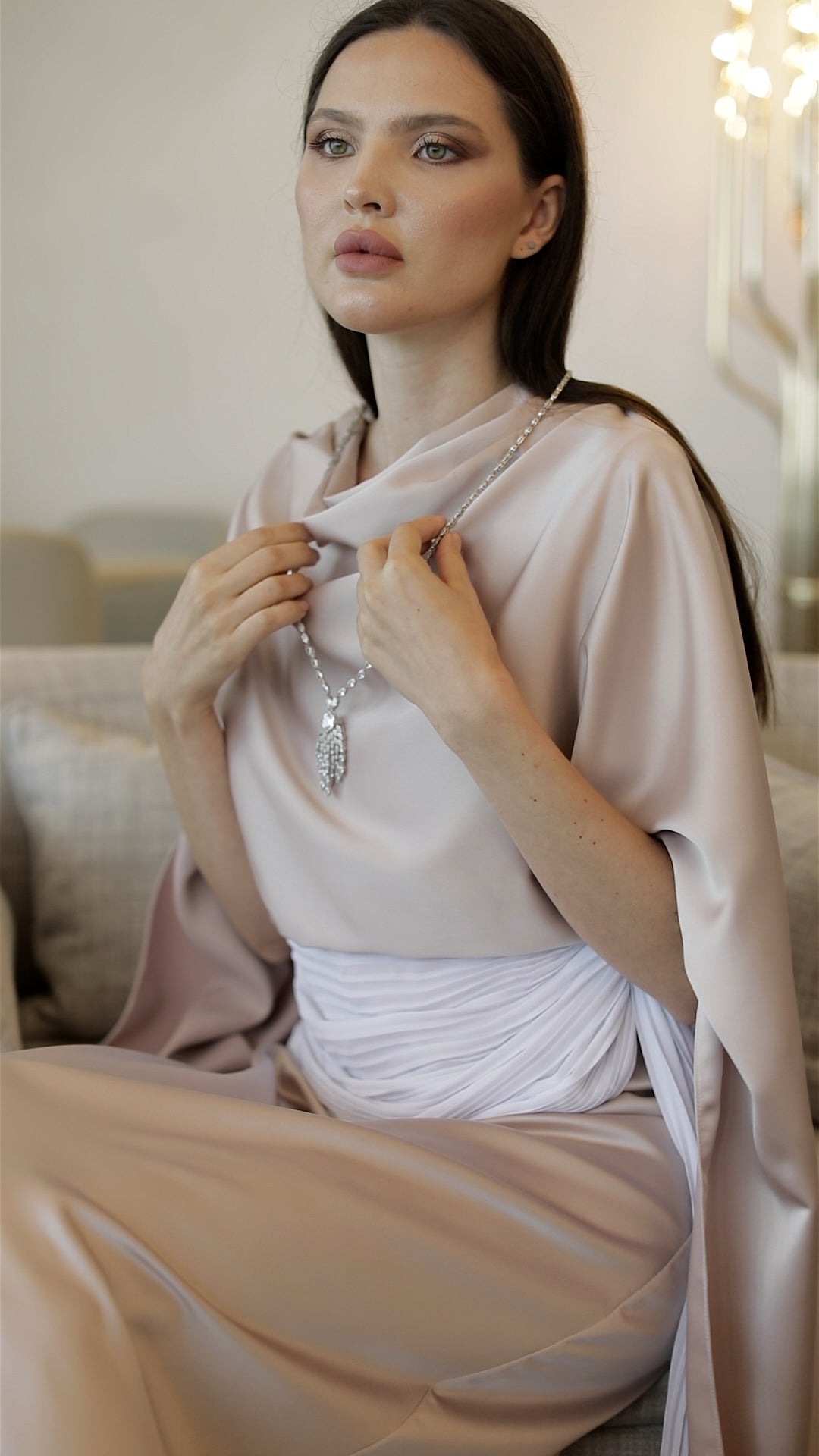 The satin long dress is a perfect choice for any special occasion. The satin material gives the dress a luxurious and elegant look. the dress is refined and sophisticated. The long length of the dress makes it appropriate for formal events such as weddings, proms, or other special occasions. ,The addition of pleats on the waist adds visual interest to the design and can help to create a flattering silhouette. this dress is a perfect choice for any special occasion because of its luxurious and elegant look, classy details and sophisticated design.