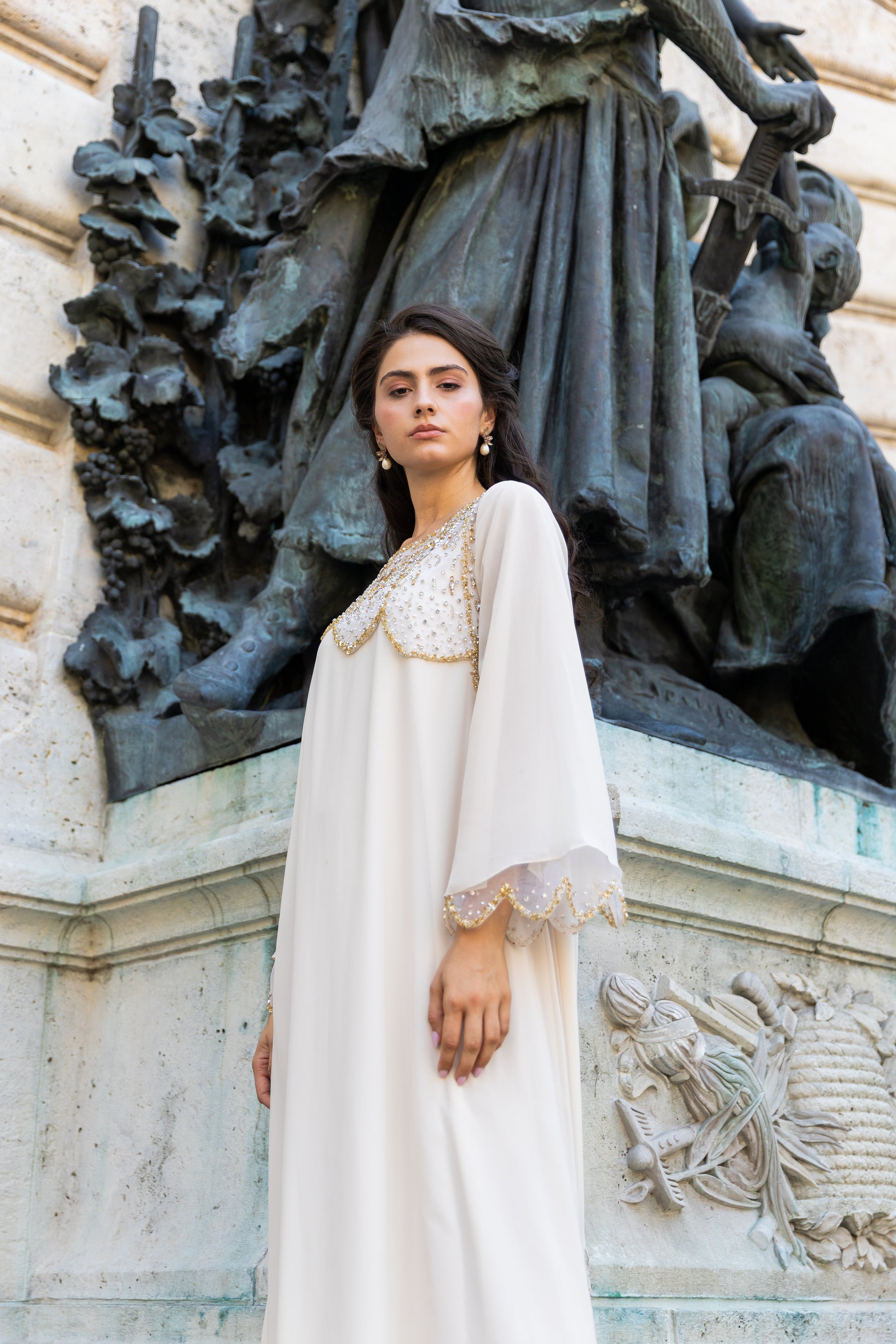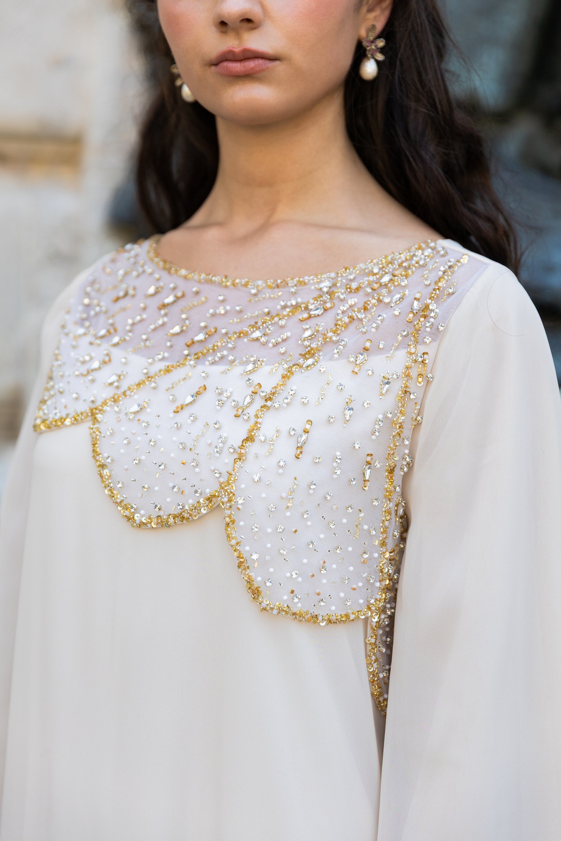 Boat neck kaftan with embroidered tulle flap on front and sleeve