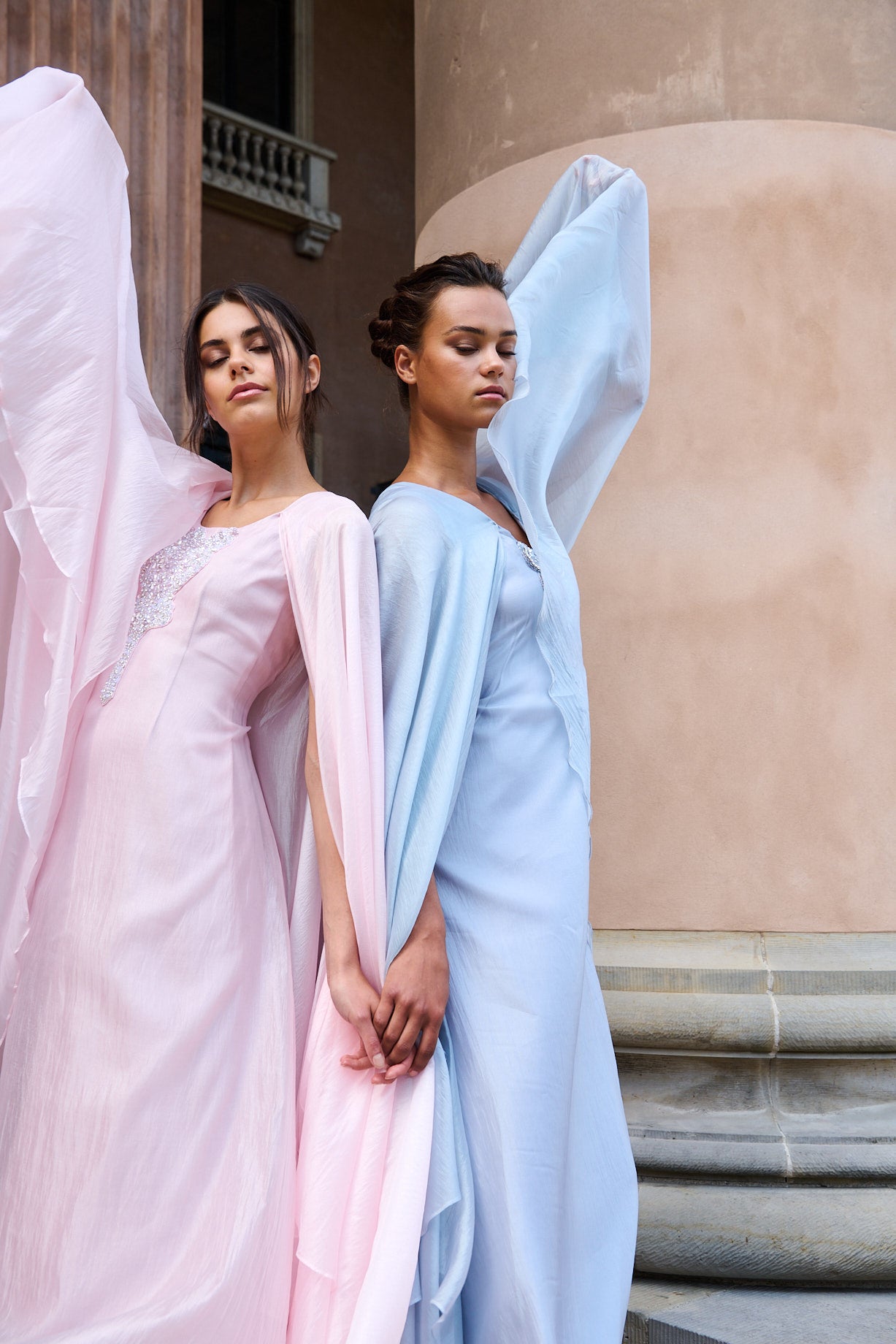 Elegant Organza Flowy Dress with Embroidered Neck Details.