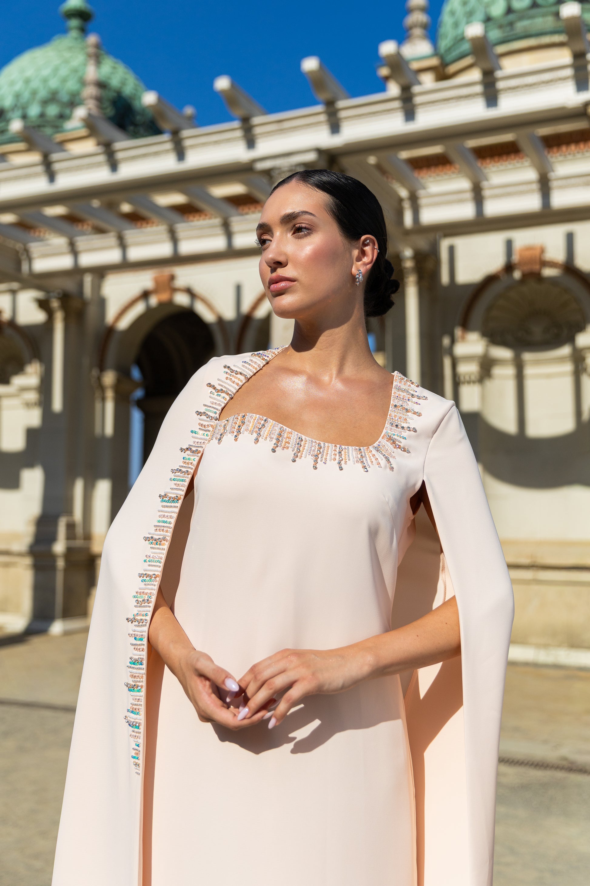 CAPE STYLE DRESS WITH WAVY NECKLINE AND CRYSTAL EMBROIDERY DETAILS
