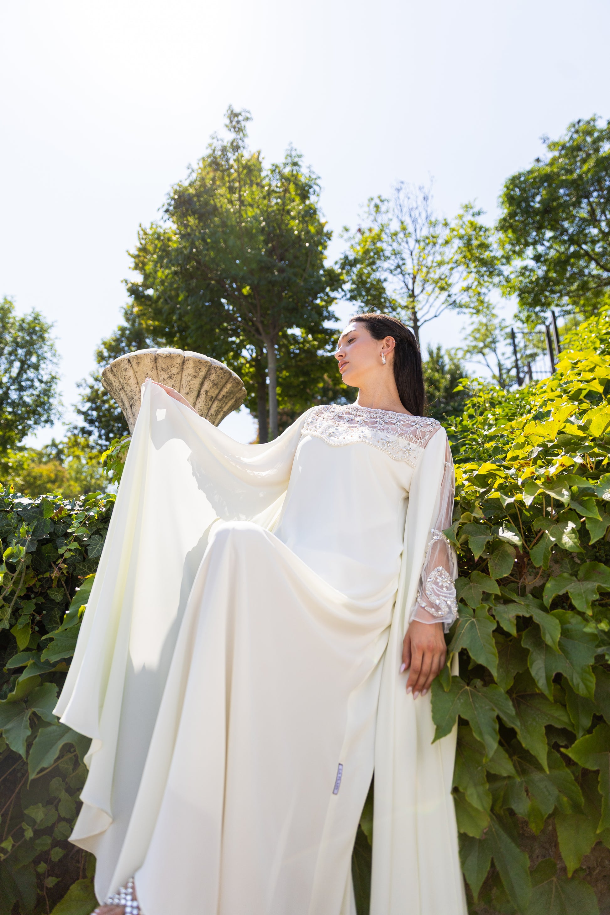 A-LINE DRESS WITH FLOWY CAPE SLEEVES AND EMBROIDERED MESH ON FRONT AND SLEEVES