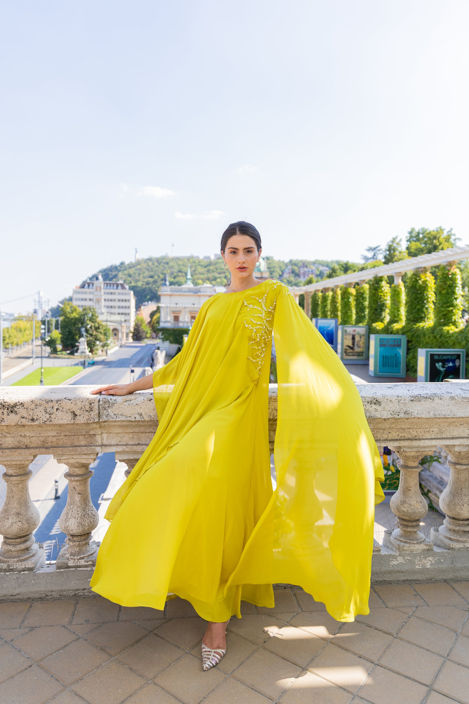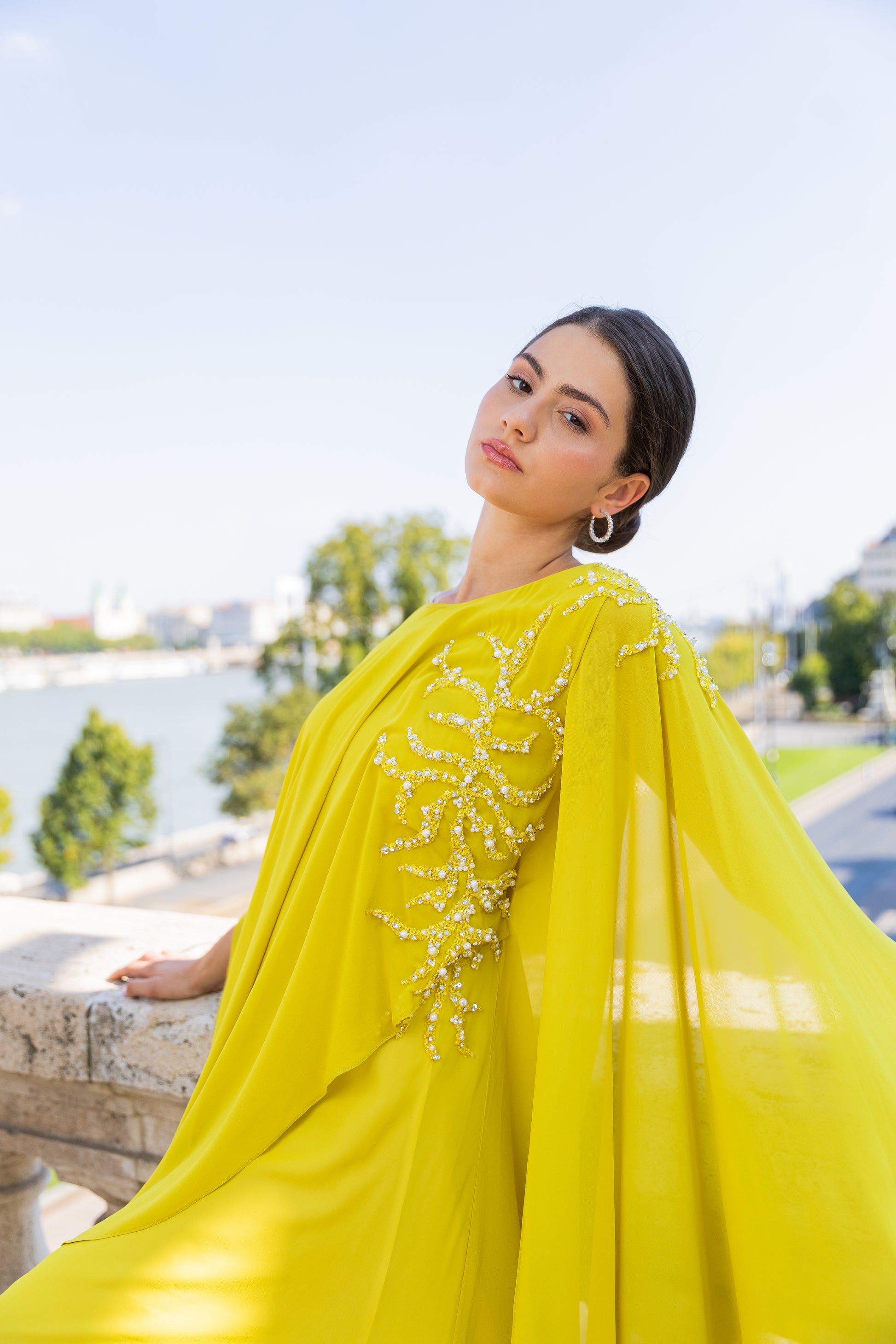 ROUND NECK DRESS WITH A ONE-SIDED DRAPE AND CAPE SLEEVES, WITH EMBROIDERY ON THE SIDE