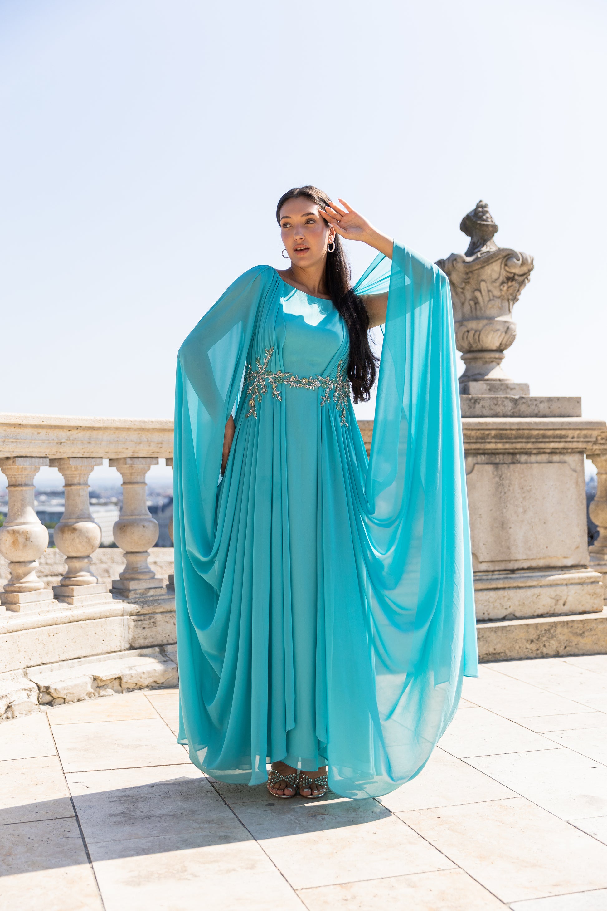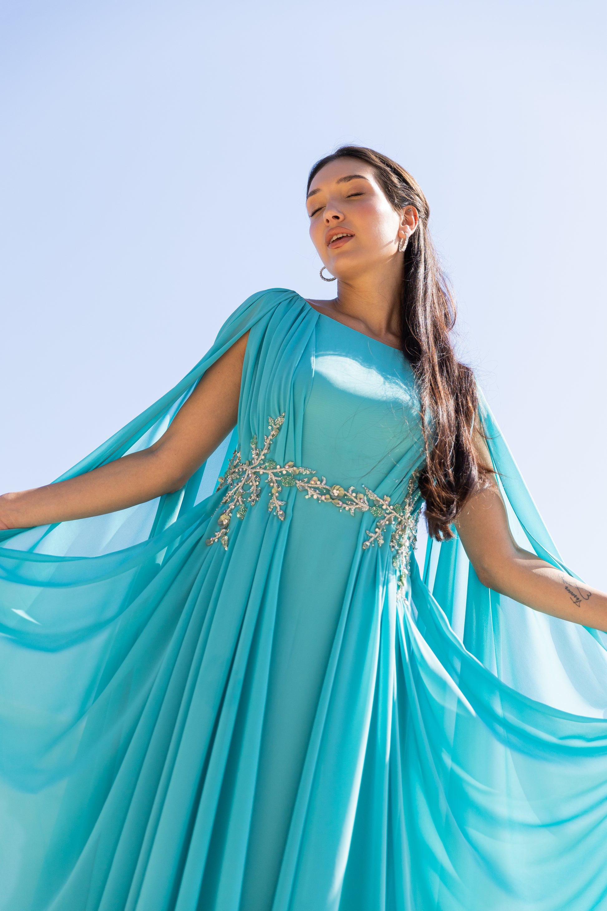 DRESS WITH PLEATED WAIST PAIRED WITH DETACHABLE TWISTED CAPE