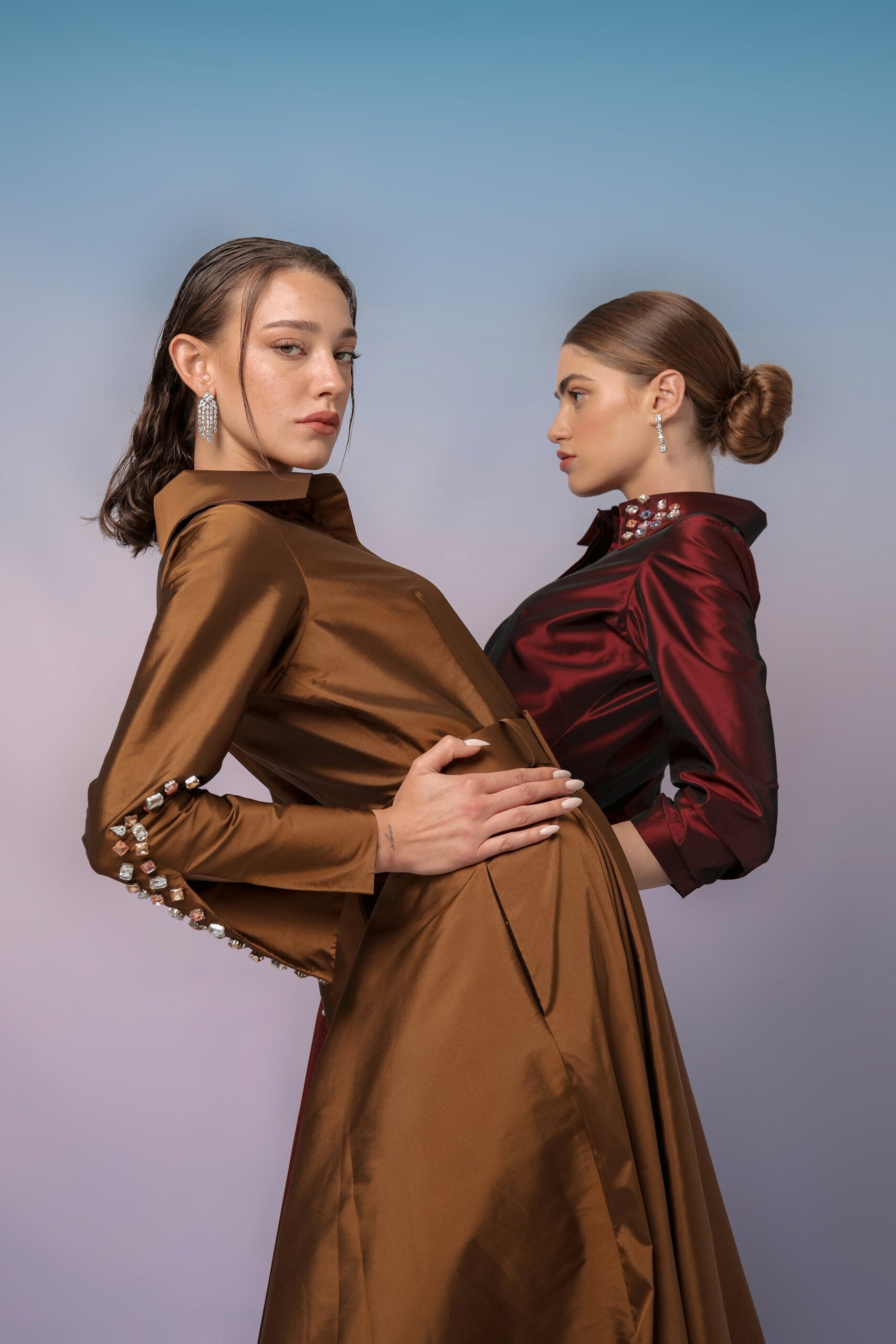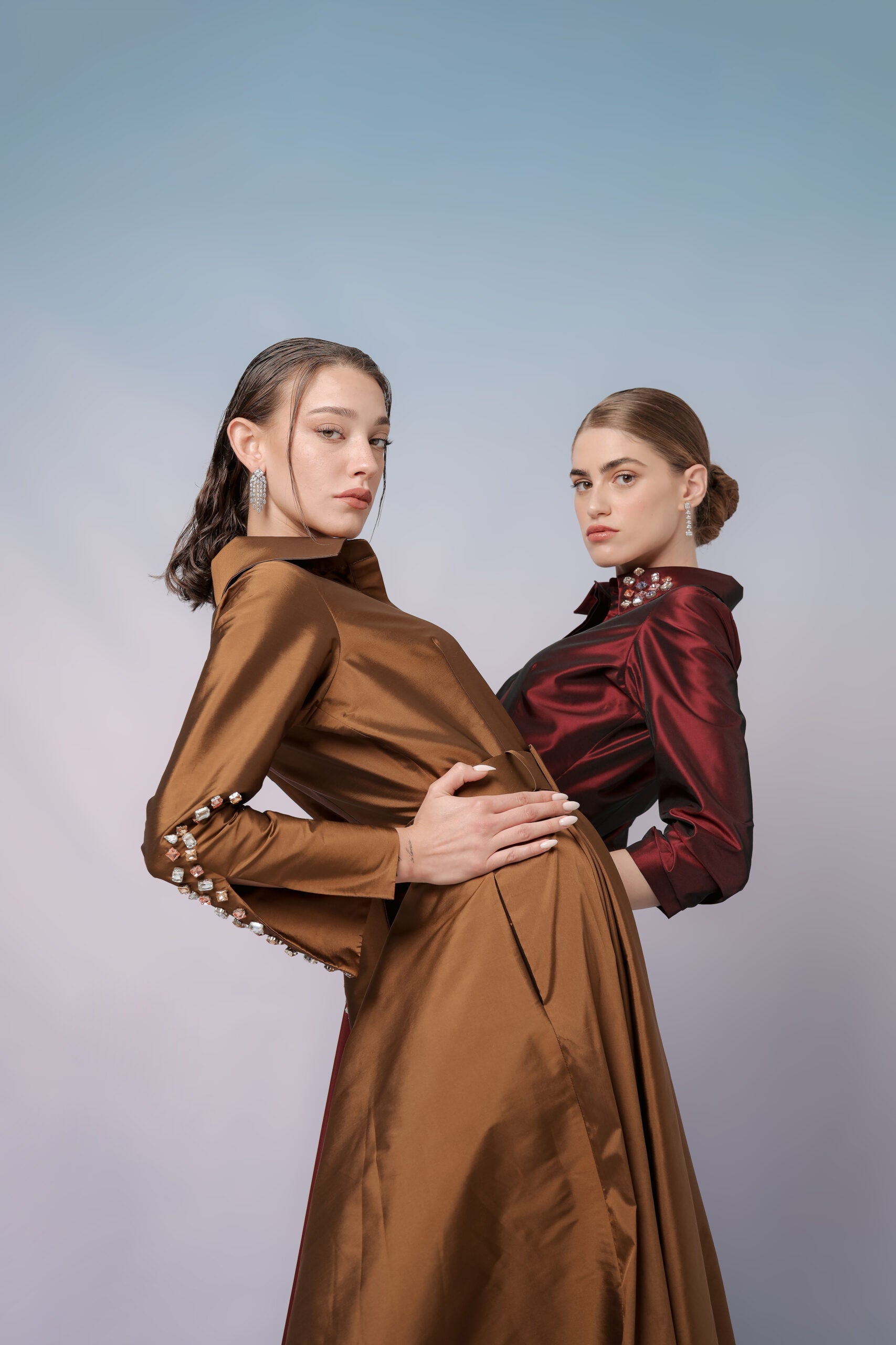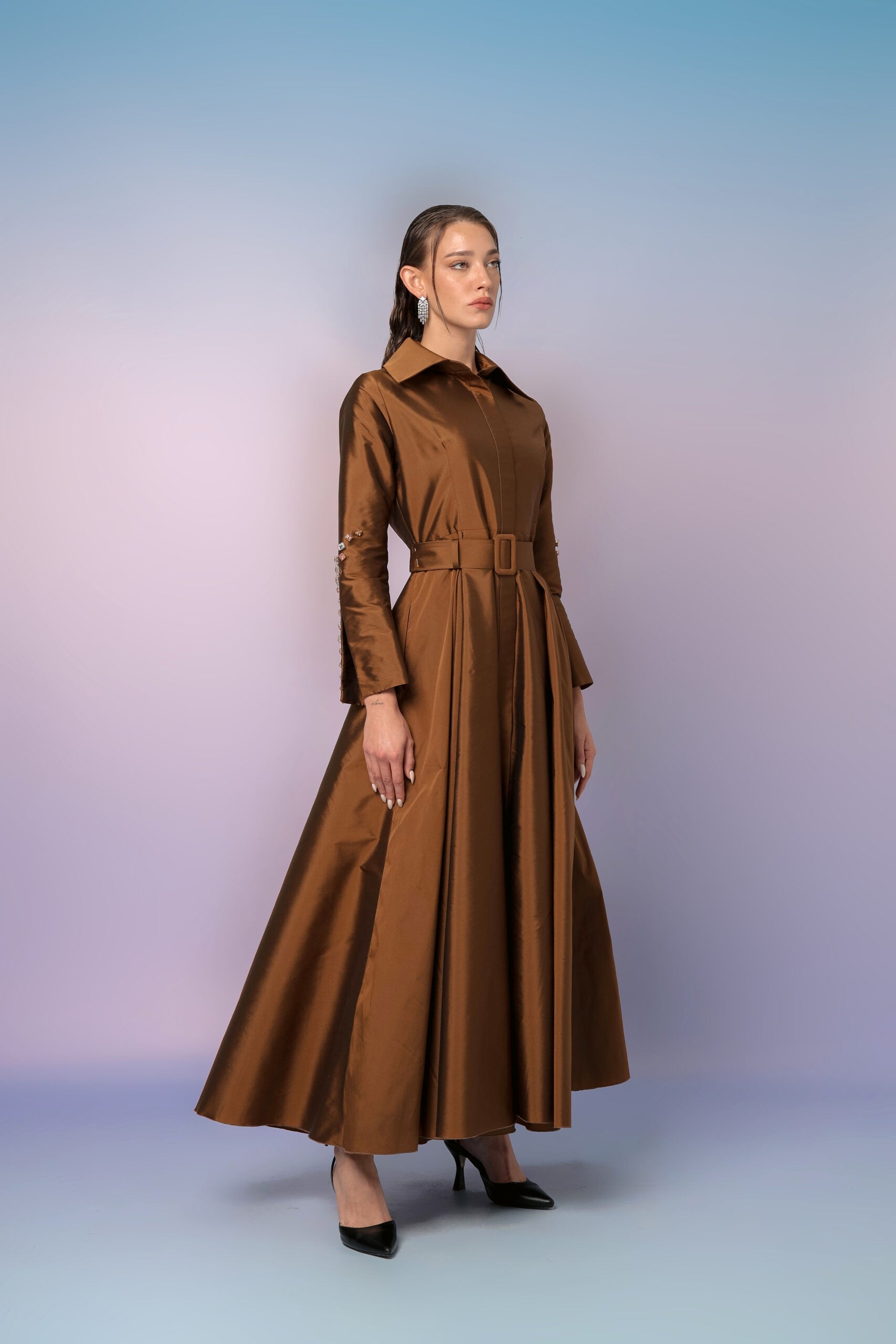The layered sleeves and the accompanying belt, which can be tied up, combine to create a luxuriant glistening effect. This ensemble exudes elegance and sophistication, ensuring you stand out at any event you attend.
