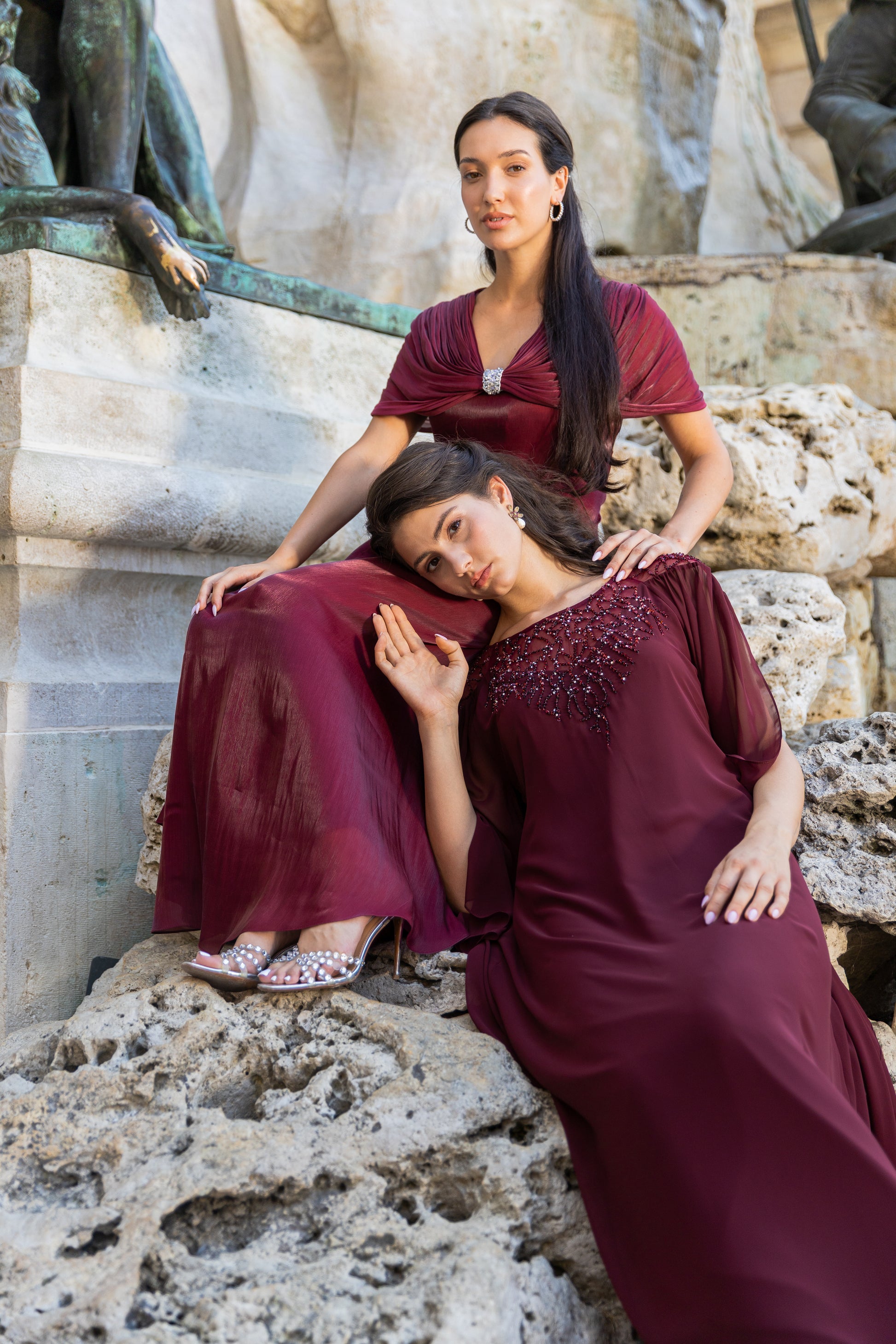 COWL NECK DRESS WITH DETACHABLE CRYSTAL BROACH AND CRISS-CROSS STRINGS ON BACK